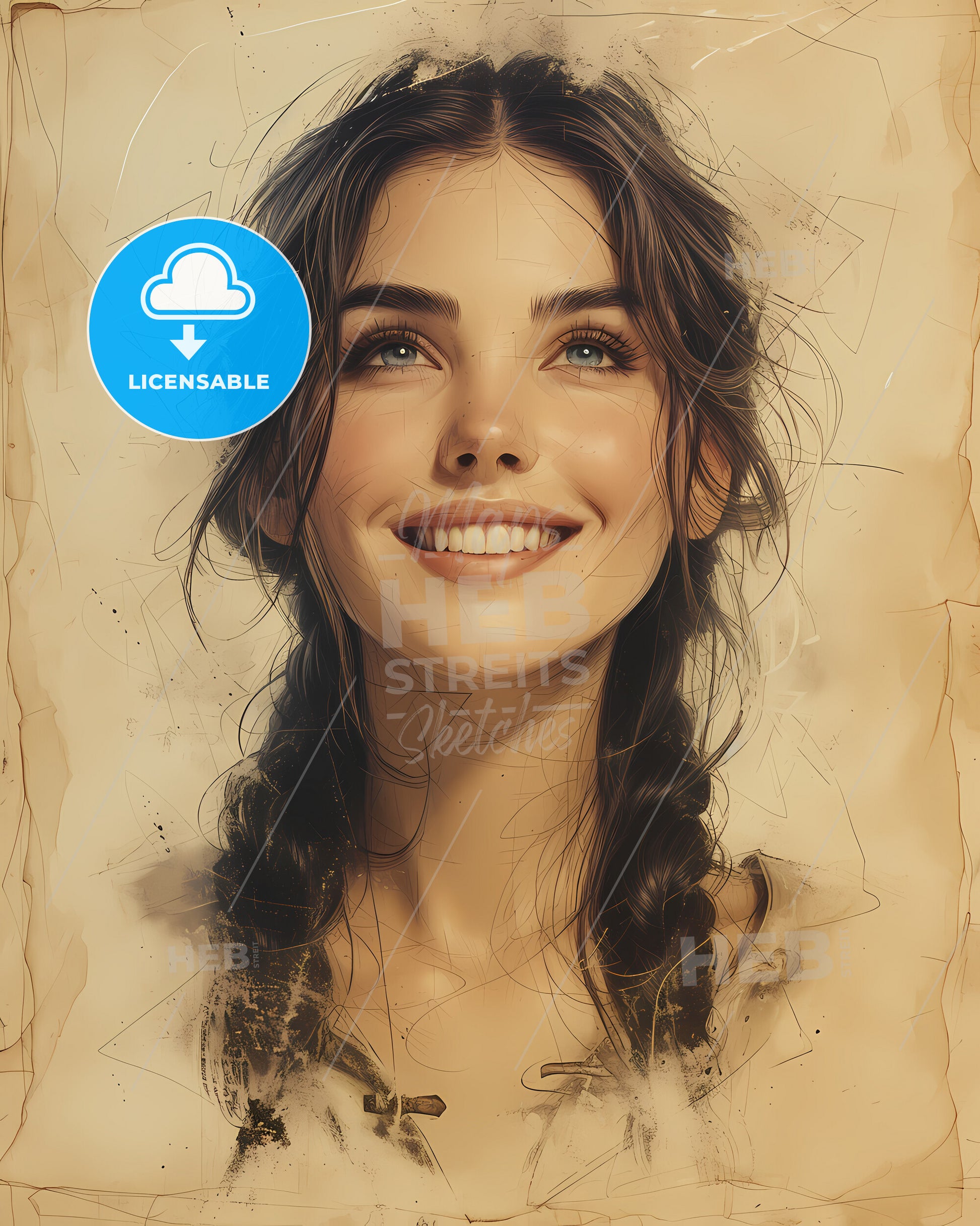 Portrait of Olga of Kiev, c. 890 - c. 969, Regent of Kievan Rus', Known for her political acumen and revenge against the Drevlians. smiling. Vintage art illustration on bright beige paper background - historic art style, sweeping overdrawn lines, subtile colored artwork, that captures the playful spirit and vivid imagination of modern art.