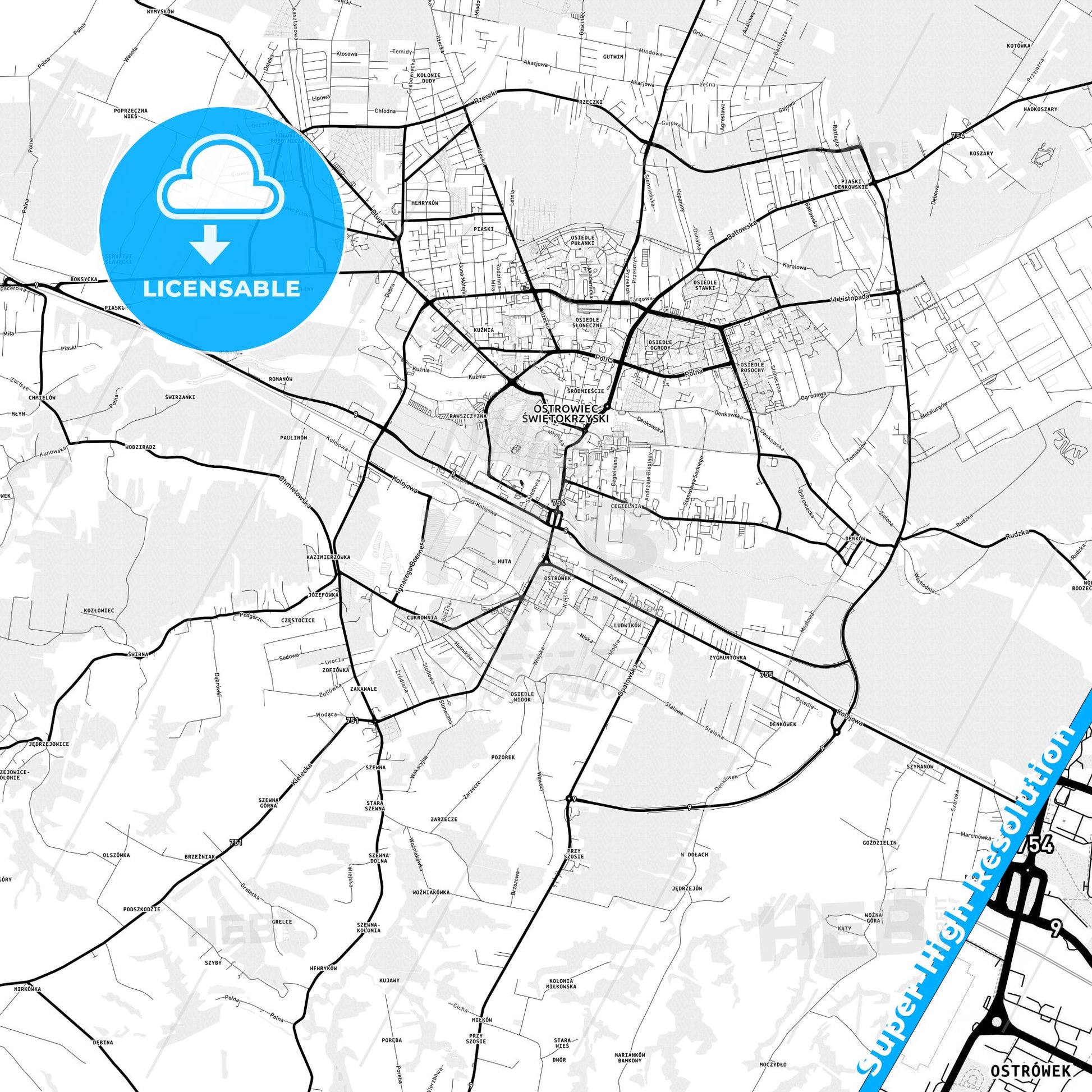Ostrowiec Świętokrzyski, Świętokrzyskie, Poland in high-resolution, minimalist map designed for printed use. This detailed black and white map accurately highlights the street network and urban layout, making it an ideal ready-to-use map for your business.