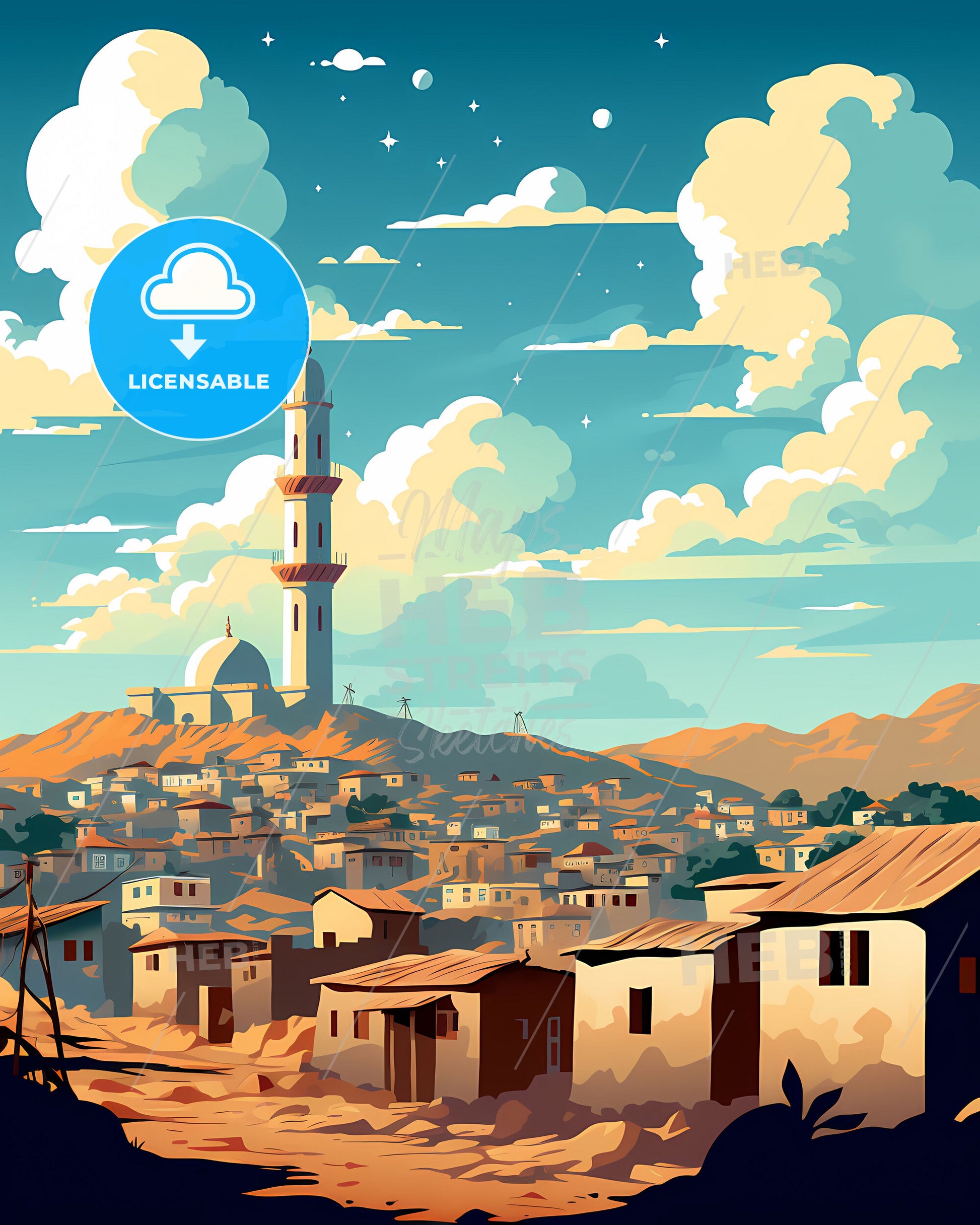 Ouagadougou Burkina Faso Skyline. art painting with blue sky some bright clouds in spring. in style of classic advertising illustration with nice gradients. Nice strokes and outlines. Large area of copy space on top. litte bright sparkles