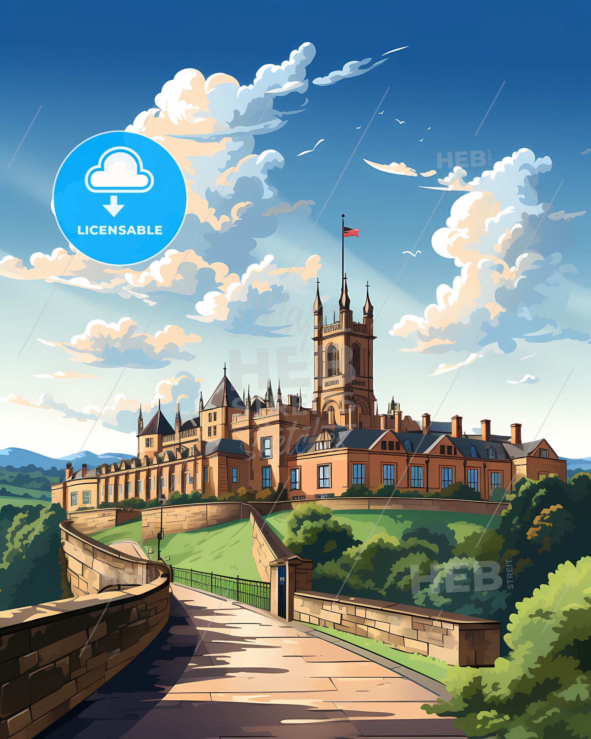 Oxford, South East England, Skyline. art painting with blue sky some bright clouds in spring. in style of classic advertising illustration with nice gradients. Nice strokes and outlines that captures the playful spirit and vivid imagination of modern art.