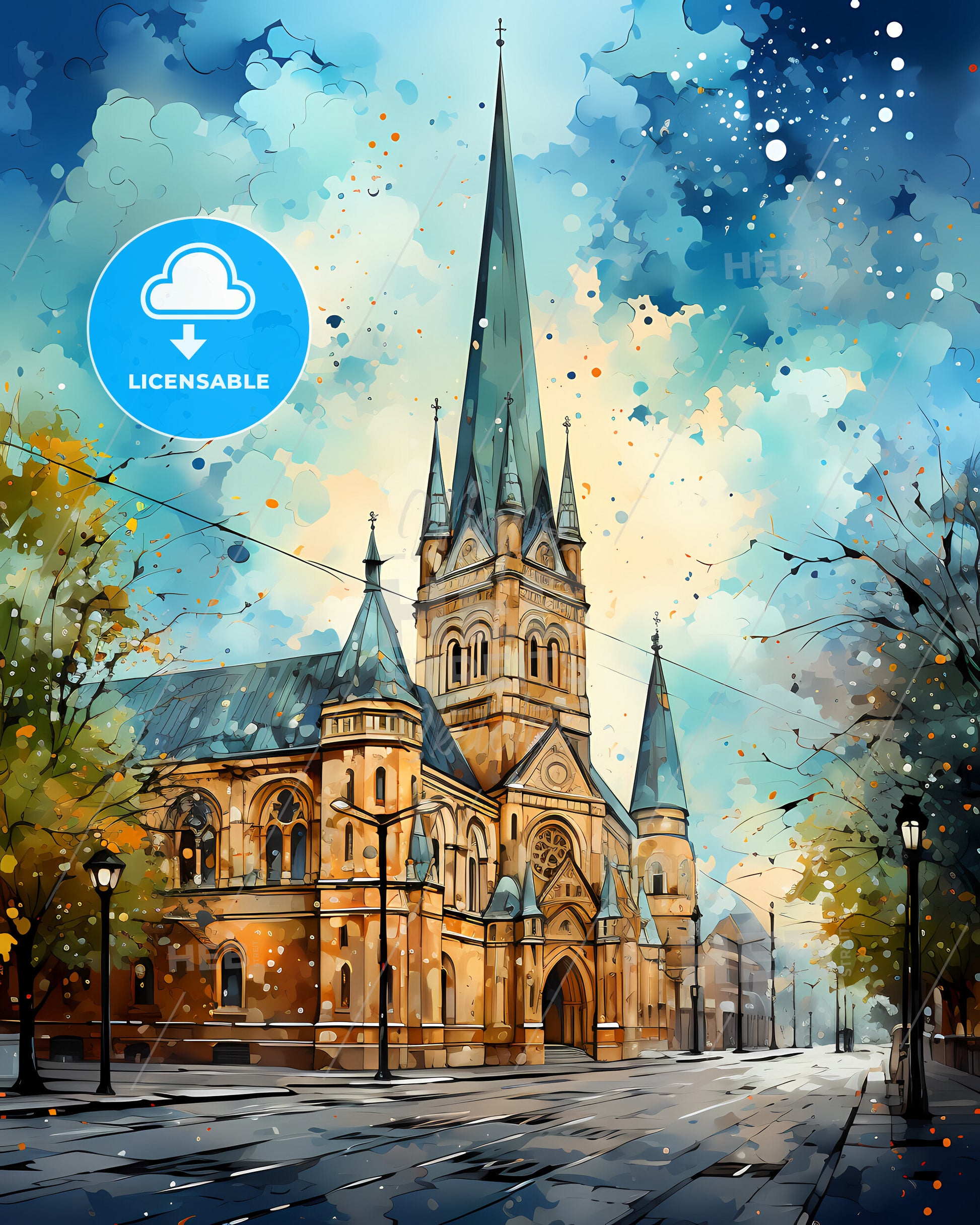 Parma, Emilia-Romagna, Italy, Skyline. art painting with blue sky some bright clouds in spring. in style of classic advertising illustration with nice gradients. Nice strokes and outlines that captures the playful spirit and vivid imagination of modern art.