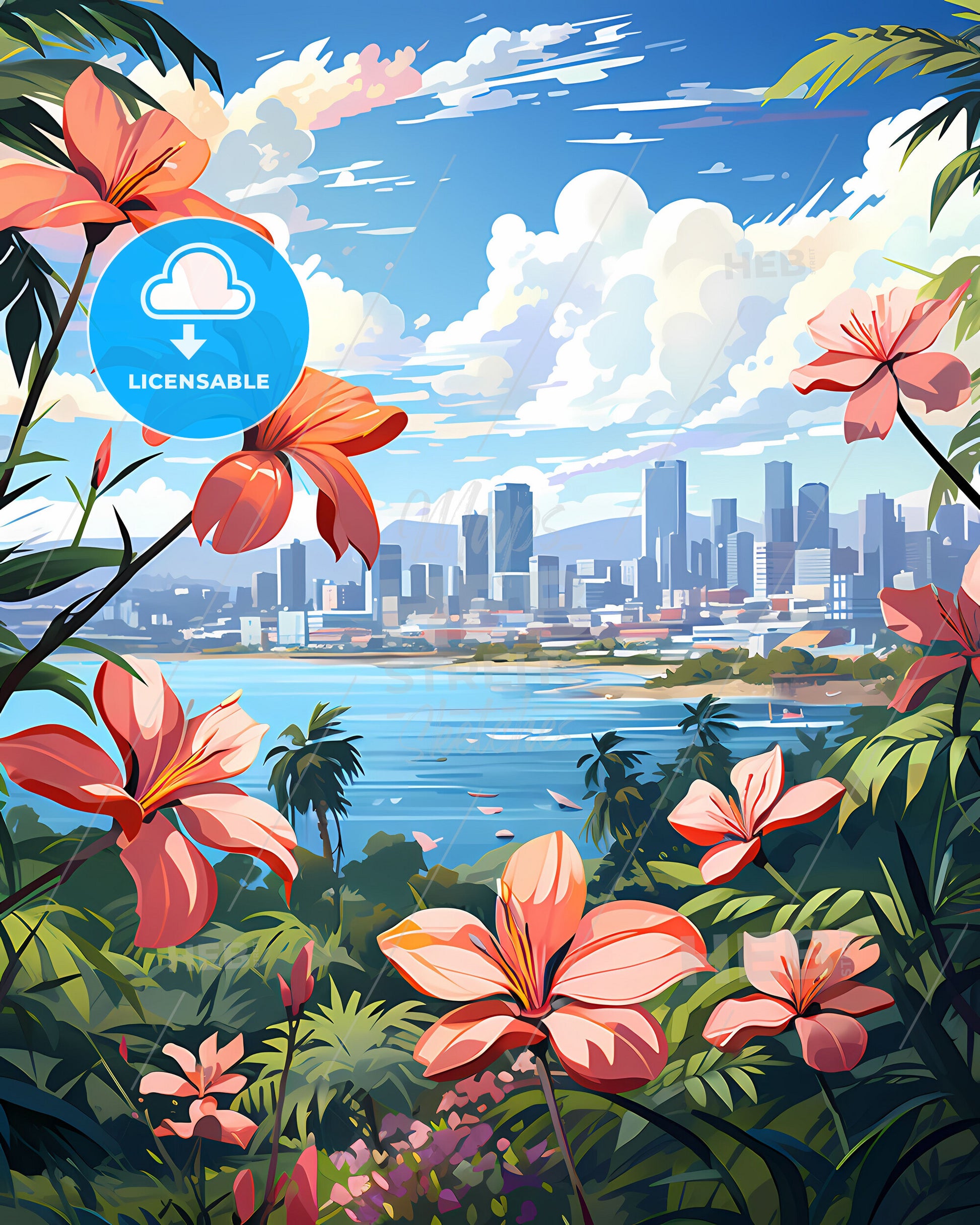 Pasig Philippines Skyline. art painting with blue sky some bright clouds in spring. in style of classic advertising illustration with nice gradients. Nice strokes and outlines. Large area of copy space on top. litte bright sparkles
