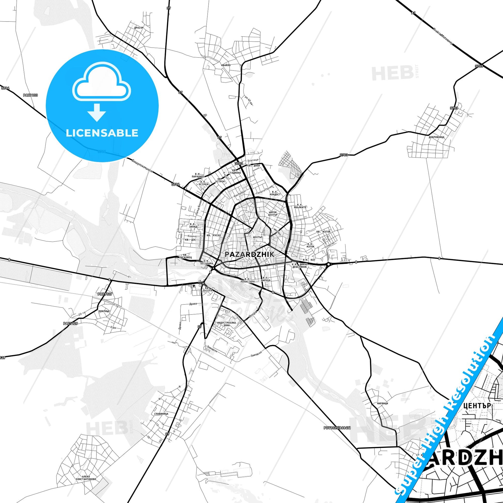Pazardzhik, Pazardzhik Province, Bulgaria in high-resolution, minimalist map designed for printed use. This detailed black and white map accurately highlights the street network and urban layout, making it an ideal ready-to-use map for your business.