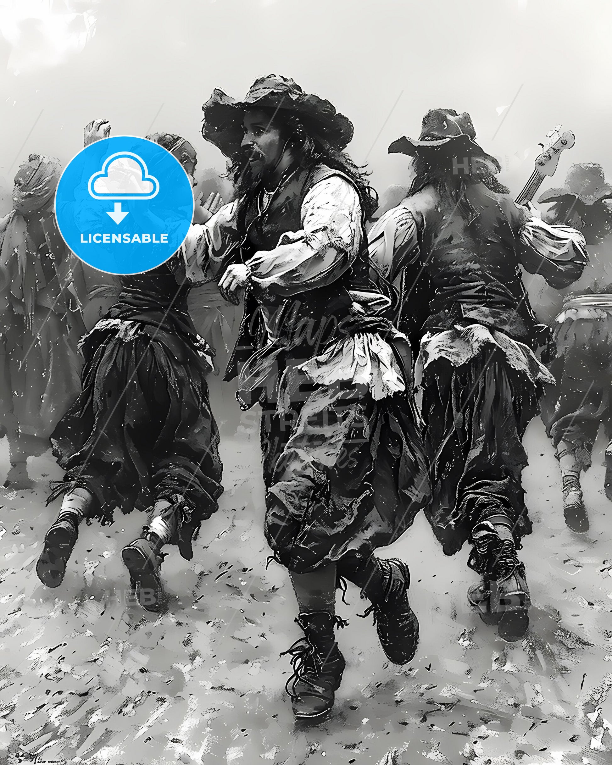 People dancing in the Renaissance style, the Renaissance era, wearing headphones, sneakers, musical instruments