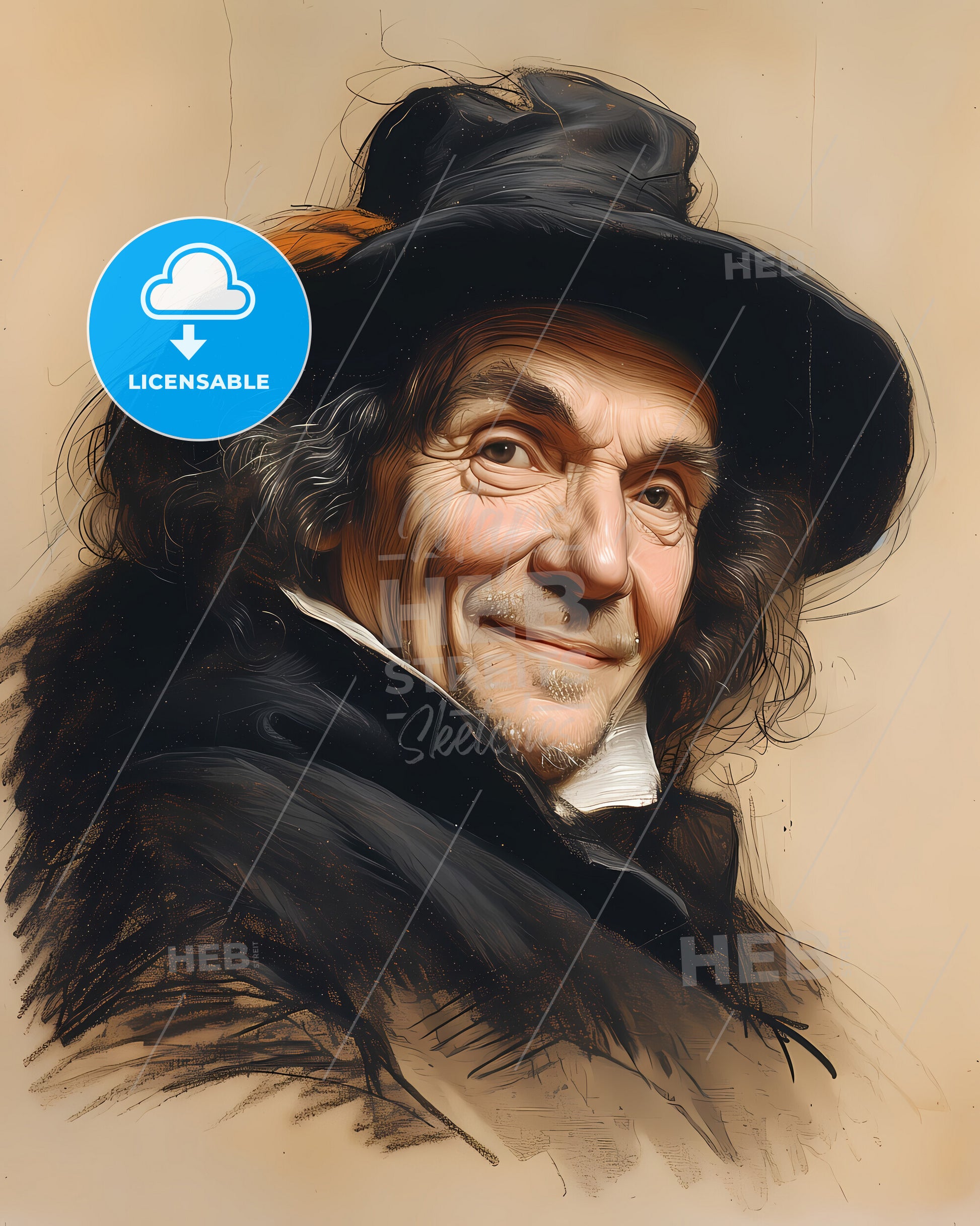 Portrait of Pierre Bayle, 1647 - 1706, Philosopher and Critic, French philosopher and critic, known for his skepticism and advocacy for religious tolerance. - smiling. Vintage art illustration on bright beige paper background, sweeping overdrawn lines, subtile colored artwork, that captures the playful spirit and vivid imagination of modern art.