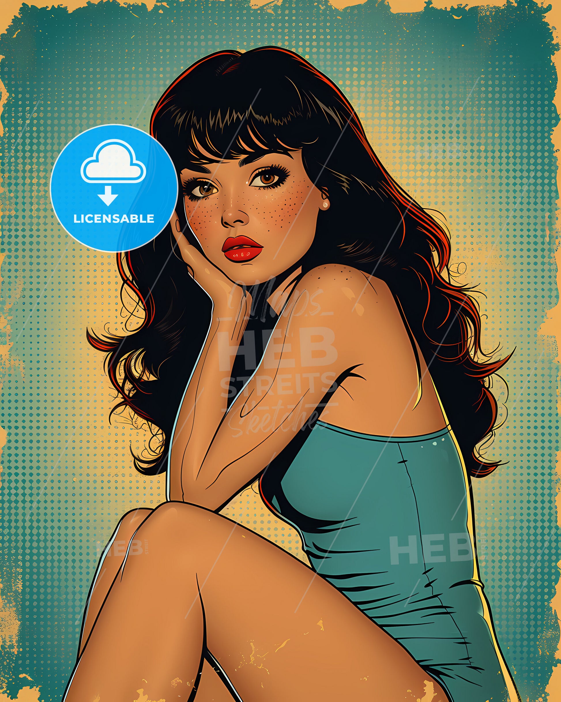 pin-up, girl full body sitting, Vintage art illustration, a woman with long hair and blue dress