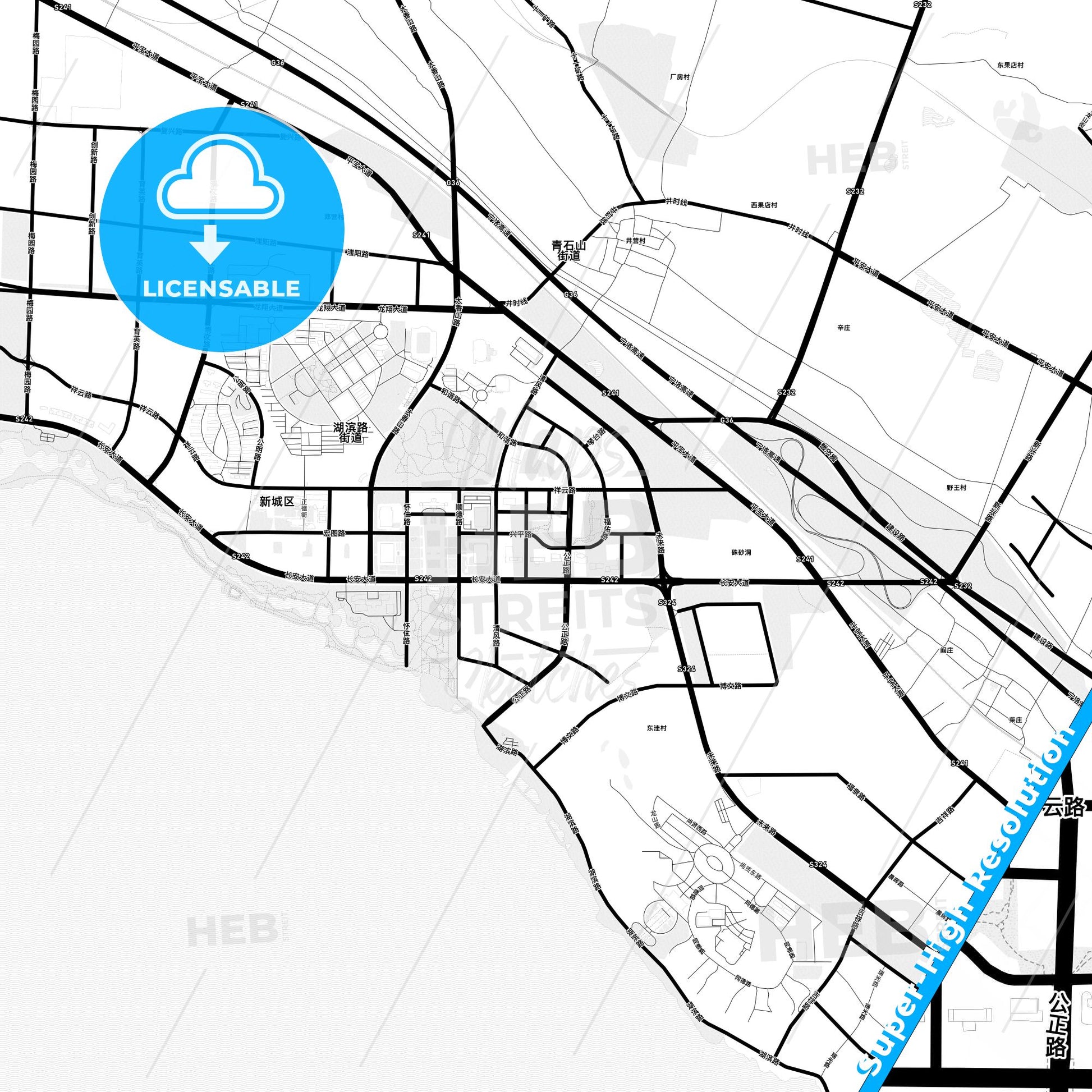 Pingdingshan, Henan, China in high-resolution, minimalist map designed for printed use. This detailed black and white map accurately highlights the street network and urban layout, making it an ideal ready-to-use map for your business.
