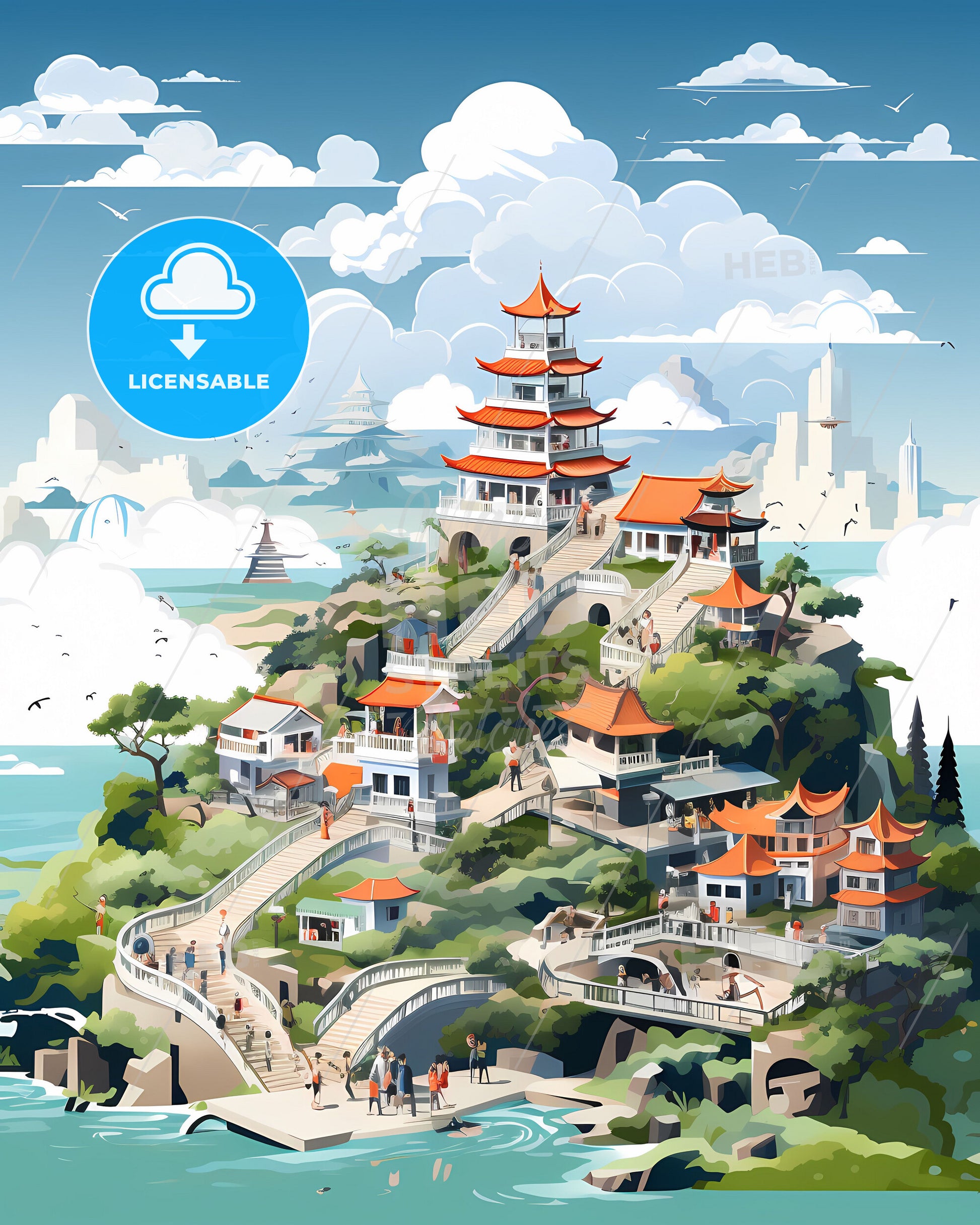 Pingtung Taiwan Skyline. art painting with blue sky some bright clouds in spring. in style of classic advertising illustration with nice gradients. Nice strokes and outlines. Large area of copy space on top. litte bright sparkles