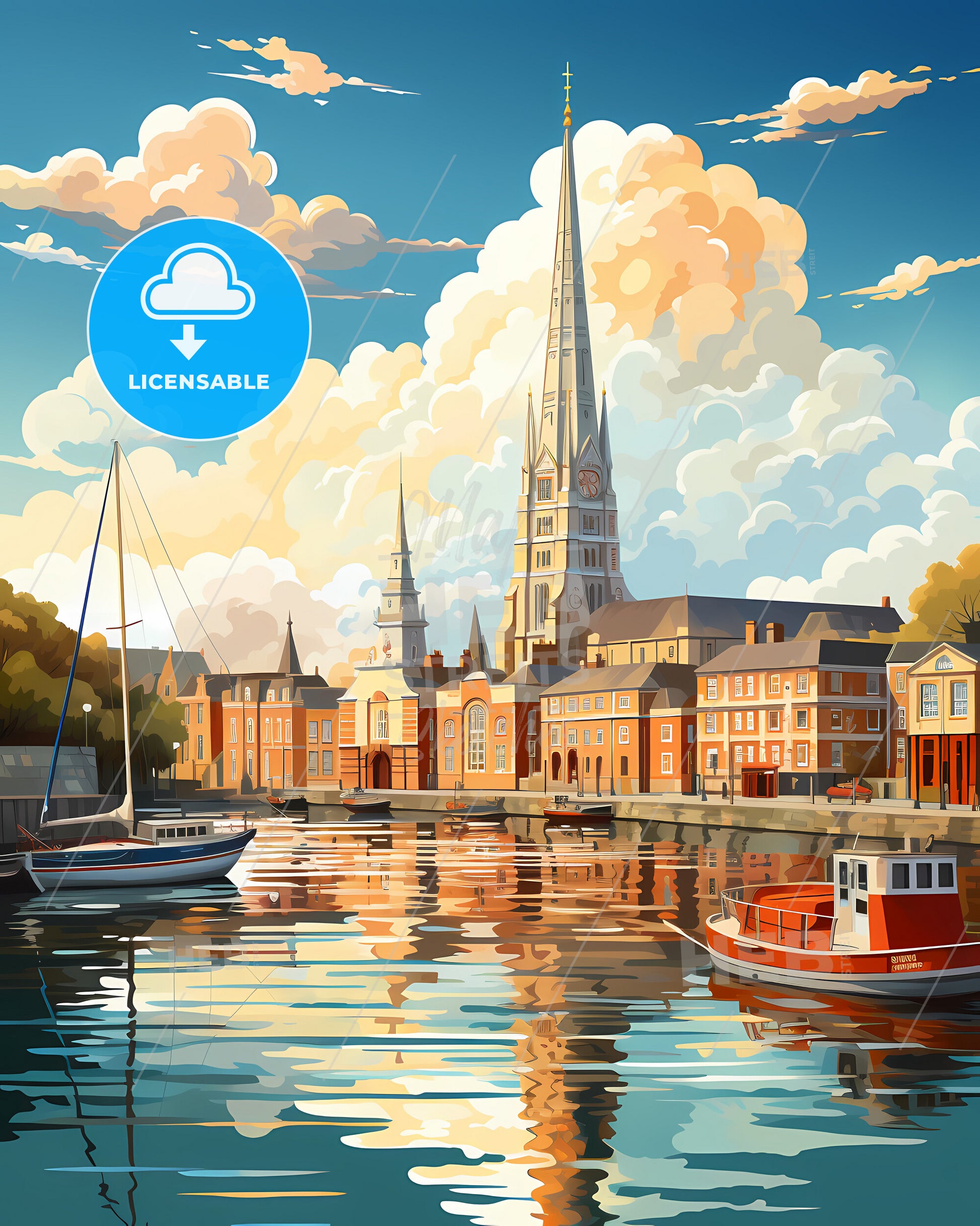 Plymouth, South West England, Skyline. art painting with blue sky some bright clouds in spring. in style of classic advertising illustration with nice gradients. Nice strokes and outlines that captures the playful spirit and vivid imagination of modern art.