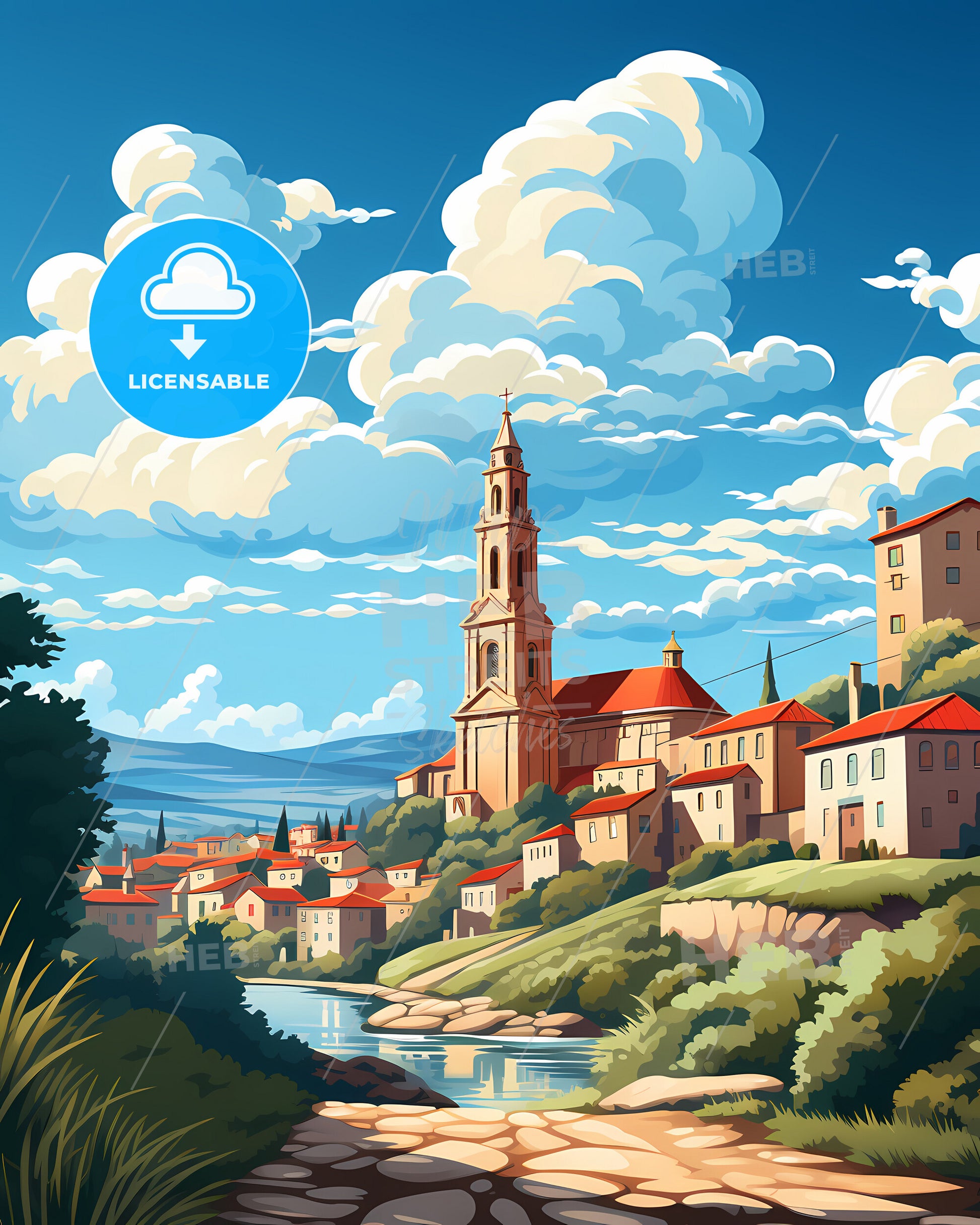 Plymouth, South West England, Skyline. art painting with blue sky some bright clouds in spring. in style of classic advertising illustration with nice gradients. Nice strokes and outlines that captures the playful spirit and vivid imagination of modern art.