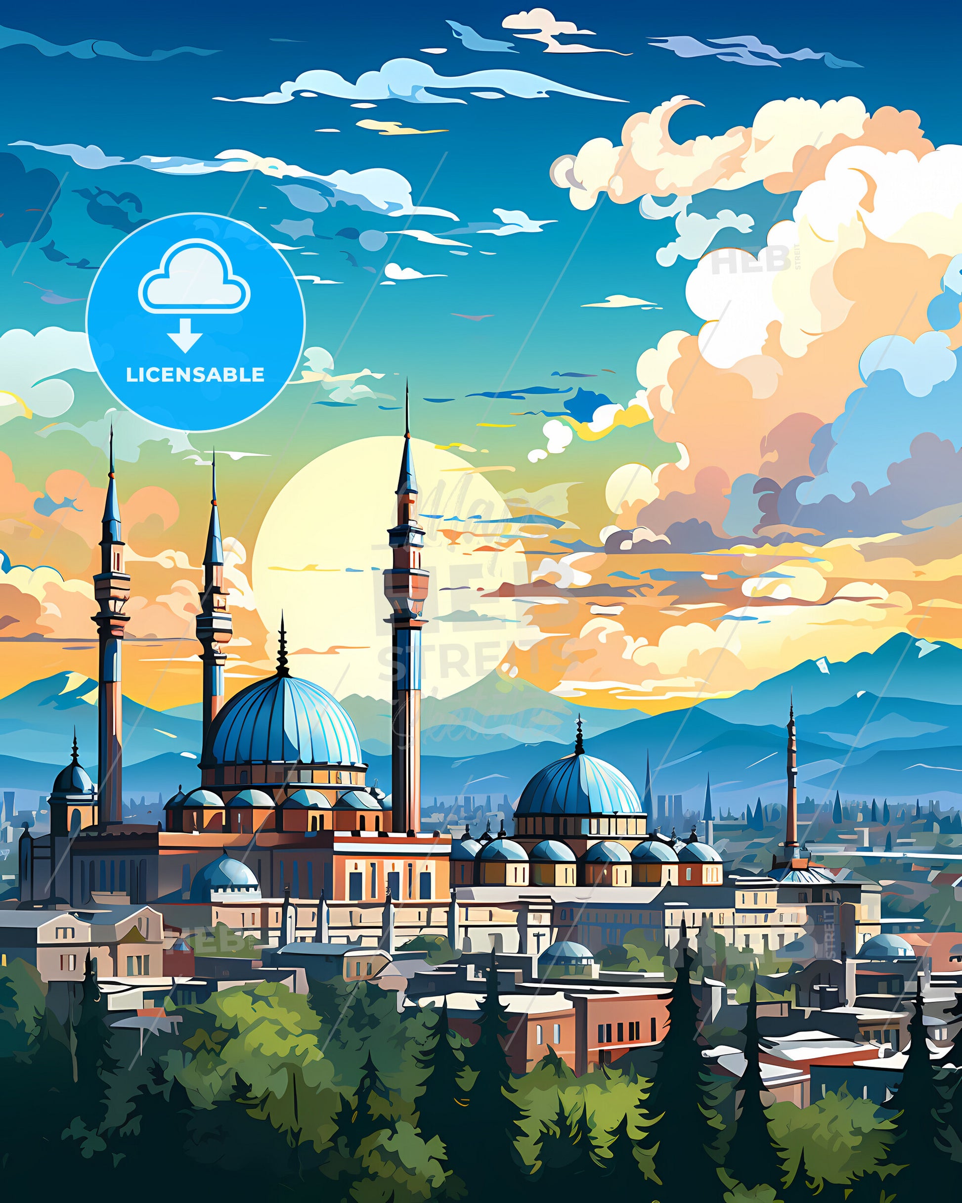 Pordenone, Friuli-Venezia Giulia, Italy, Skyline. art painting with blue sky some bright clouds in spring. in style of classic advertising illustration with nice gradients. Nice strokes and outlines that captures the playful spirit and vivid imagination of modern art.