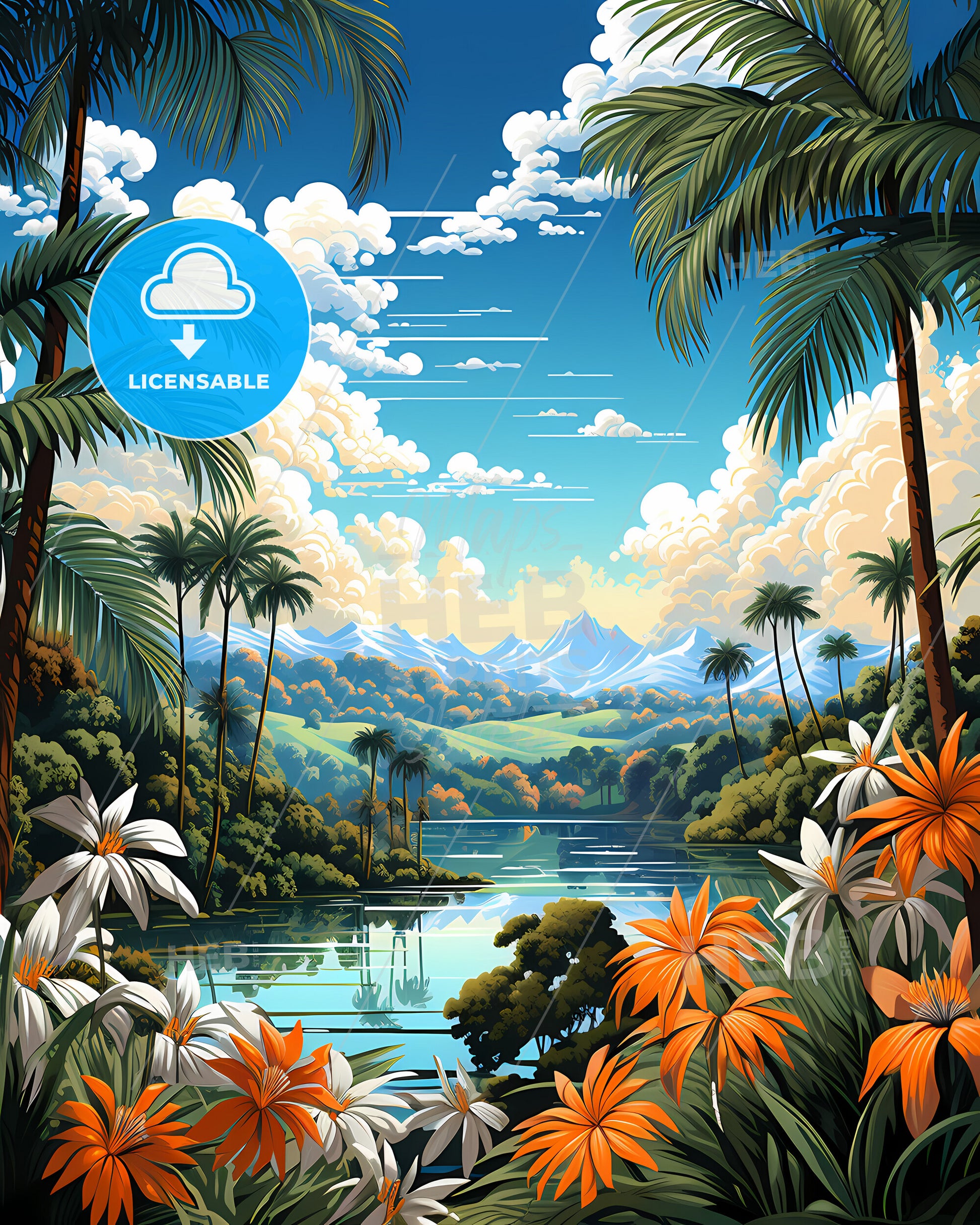 Port Orange, Florida, Skyline. art painting with blue sky some bright clouds in spring. in style of classic advertising illustration with nice gradients. Nice strokes and outlines that captures the playful spirit and vivid imagination of modern art.