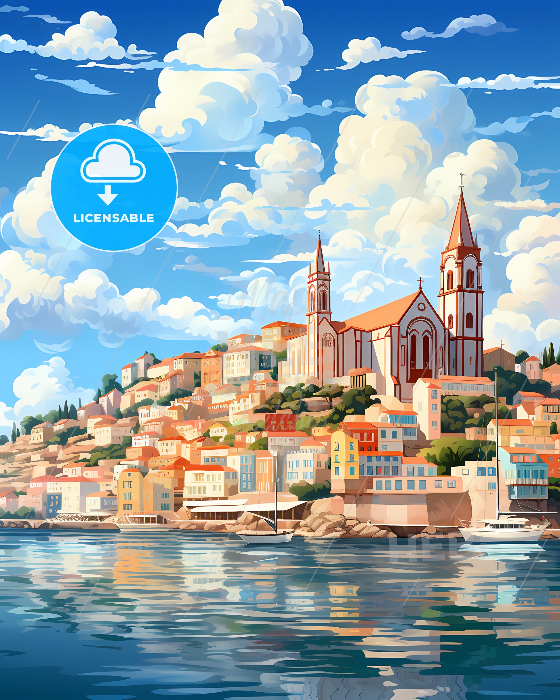 Portimao, Faro, Portugal, Skyline. art painting with blue sky some bright clouds in spring. in style of classic advertising illustration with nice gradients. Nice strokes and outlines that captures the playful spirit and vivid imagination of modern art.