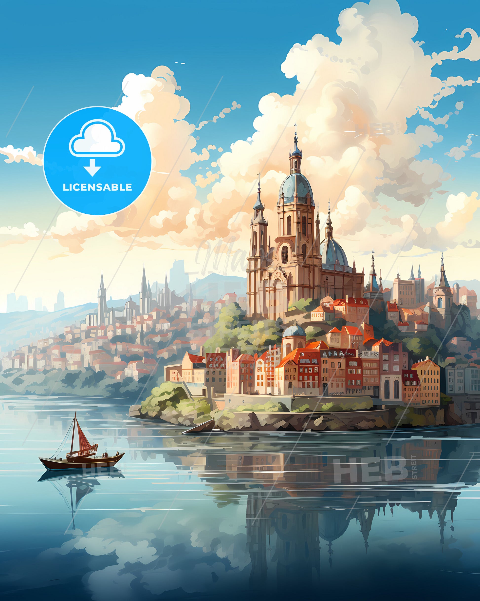 Porto, Portugal, Skyline. art painting with blue sky some bright clouds in spring. in style of classic advertising illustration with nice gradients. Nice strokes and outlines that captures the playful spirit and vivid imagination of modern art.