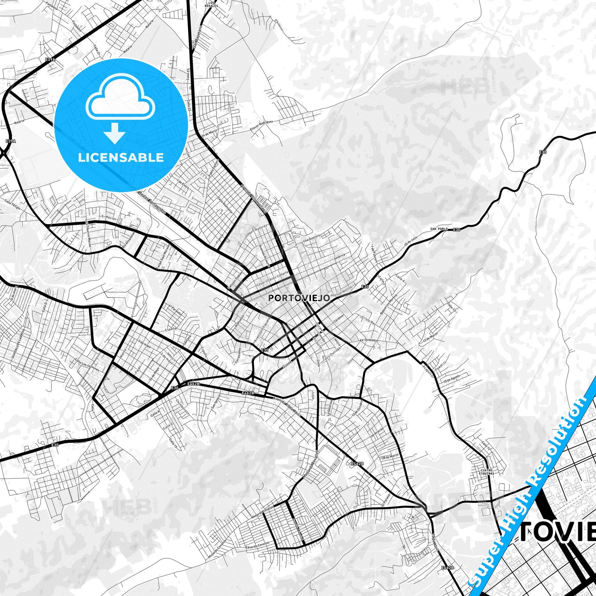 Portoviejo, Ecuador in high-resolution, minimalist map designed for printed use. This detailed black and white map accurately highlights the street network and urban layout, making it an ideal ready-to-use map for your business.