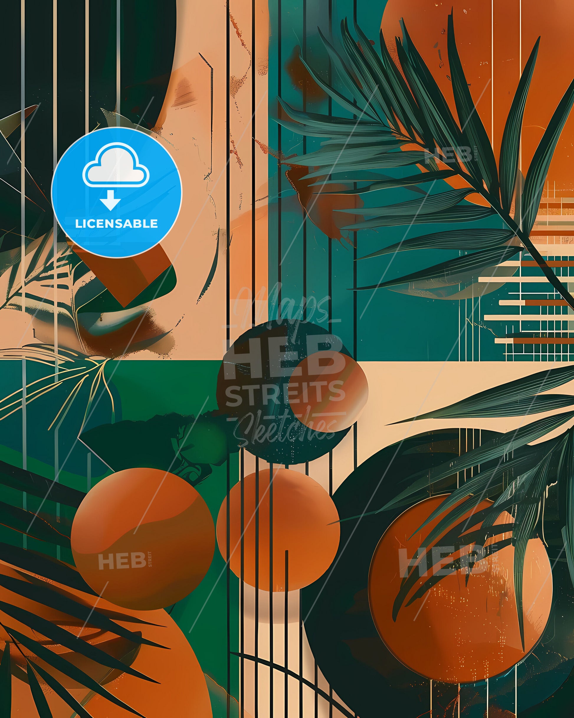 Abstract Art Painting with Palm Leaves and Circles, Modern Wall Art Decor for Living Room, Office, or Bedroom