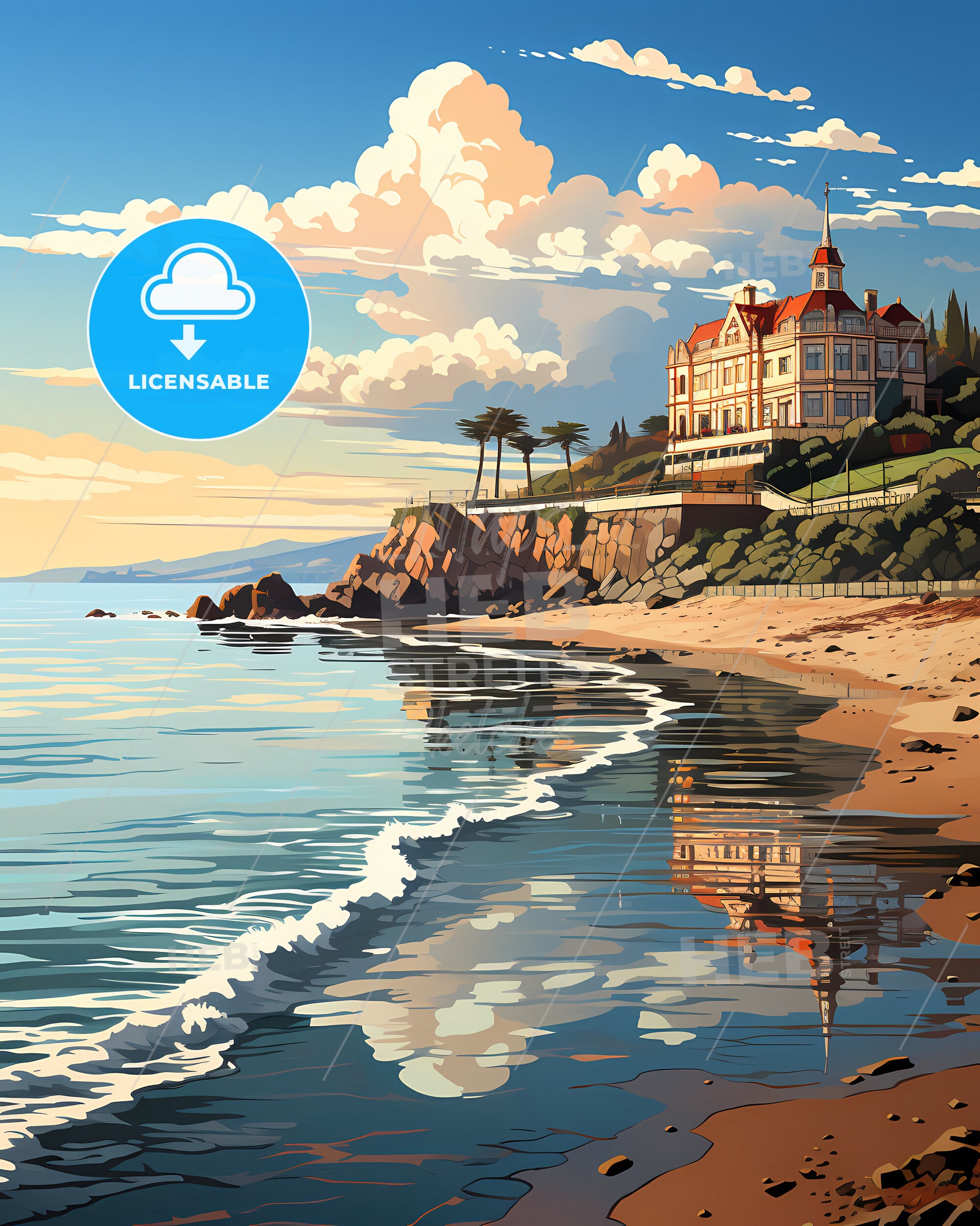 Povoa de Varzim, Porto, Portugal, Skyline. art painting with blue sky some bright clouds in spring. in style of classic advertising illustration with nice gradients. Nice strokes and outlines that captures the playful spirit and vivid imagination of modern art.
