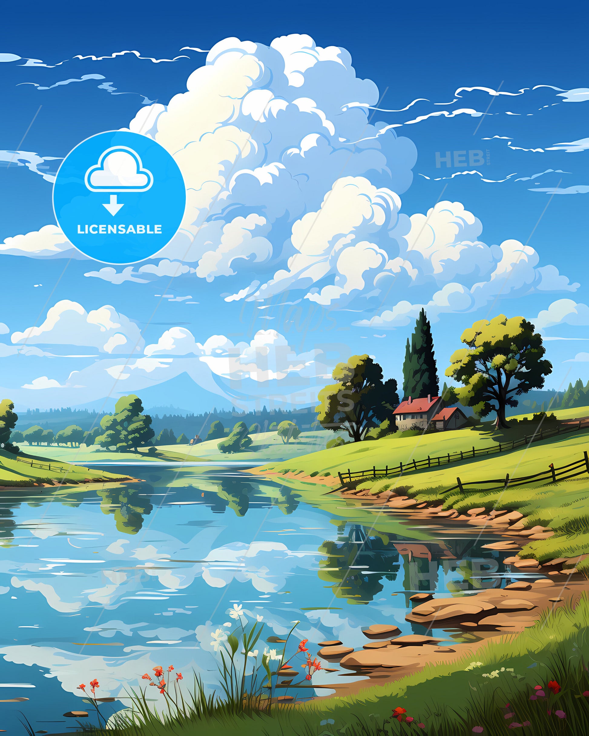 Povoa de Varzim, Porto, Portugal, Skyline. art painting with blue sky some bright clouds in spring. in style of classic advertising illustration with nice gradients. Nice strokes and outlines that captures the playful spirit and vivid imagination of modern art.