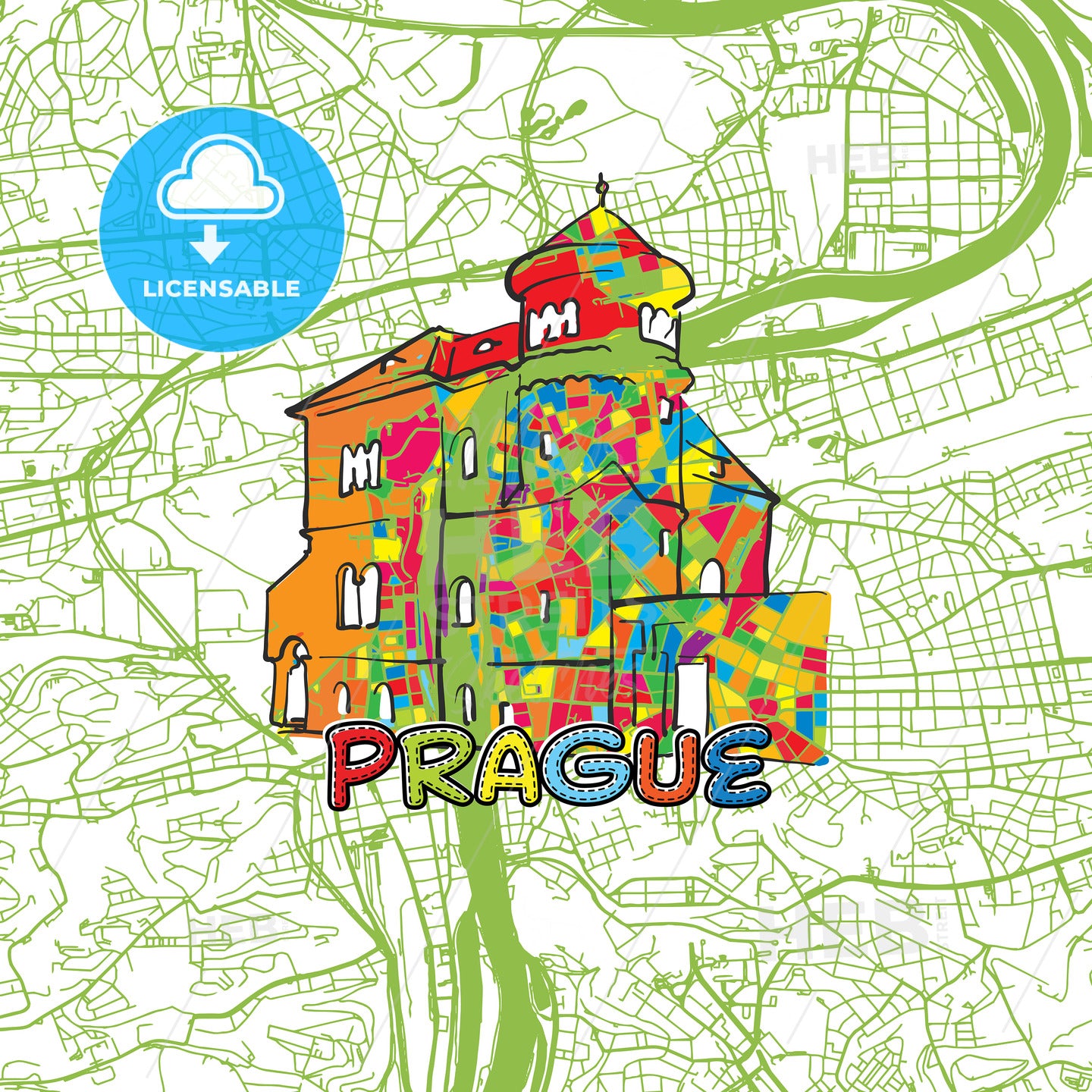 Prague Travel Art Map with downtown city map in back and colored architecture sign in front. Use for printed products such as wall art, cups, shirts and for any digital travel marketing campaign.