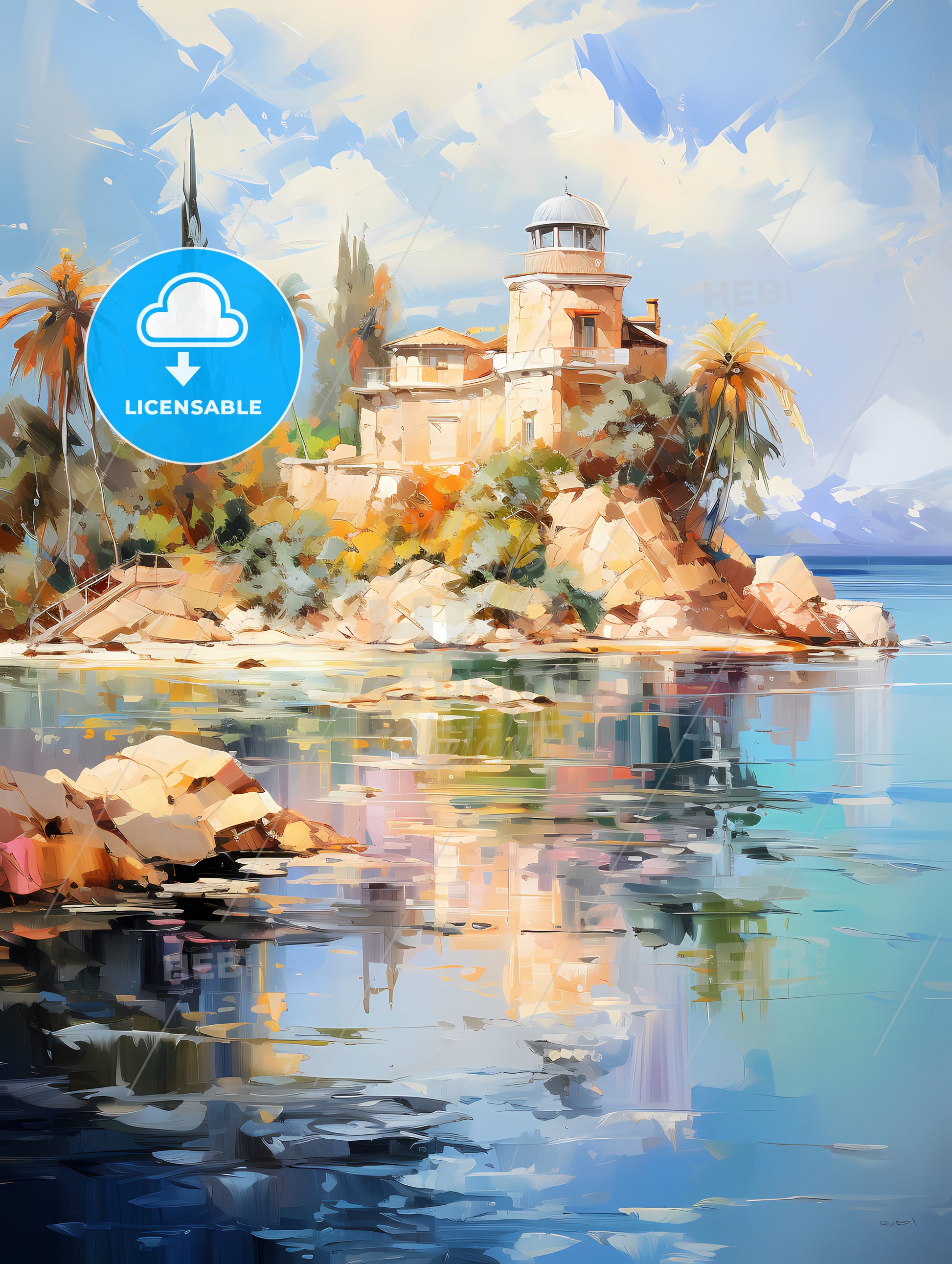 Private Island Surrounded By Sparklings - a painting of a building on an island surrounded by water