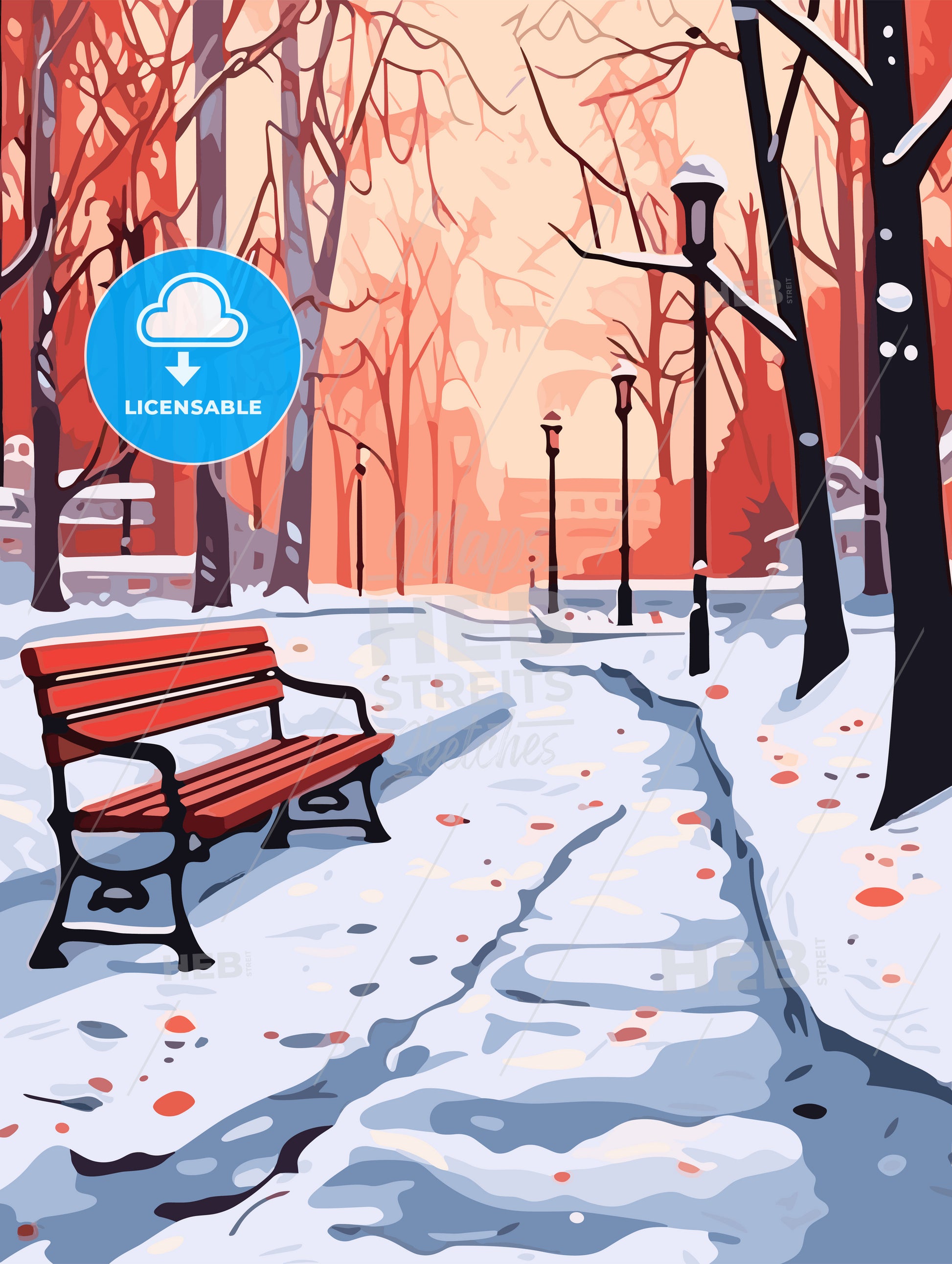 Red Benches In The Fog In Winter Poster - a bench in a snowy park