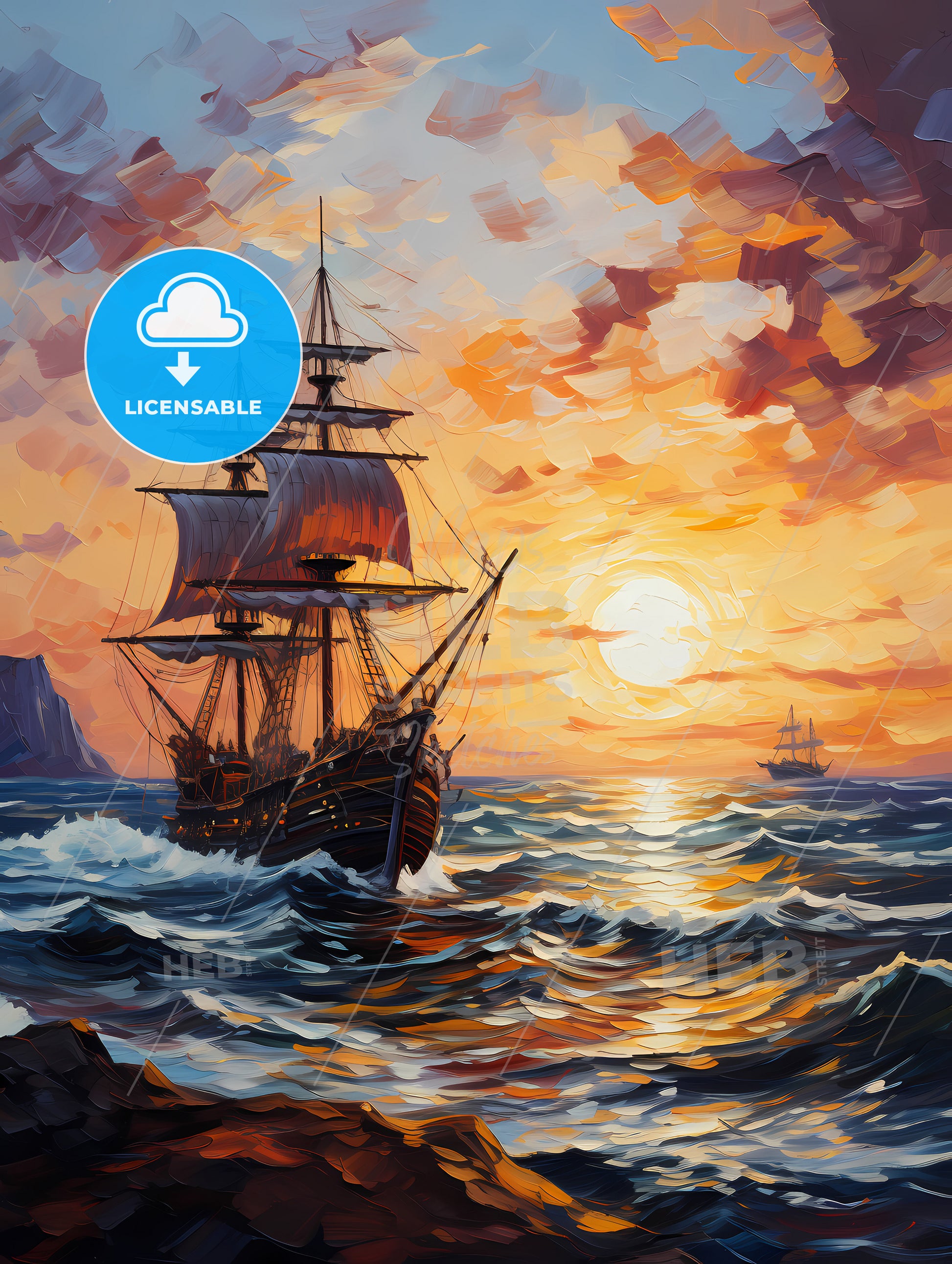 Replica Ot Vessel Santa Maria Is Passing The Port - a painting of a ship in the ocean