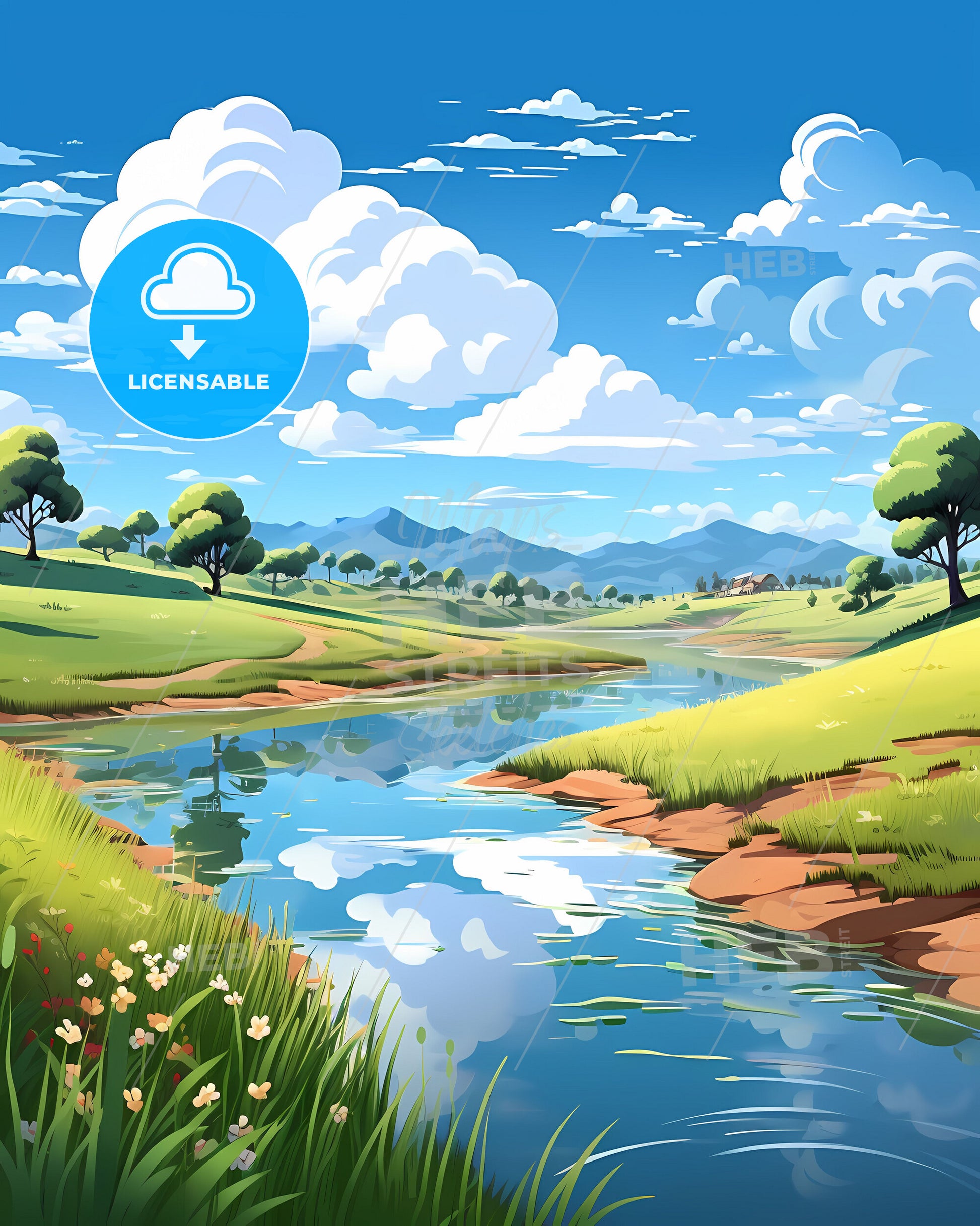 Ribeirao Preto Brazil Skyline. art painting with blue sky some bright clouds in spring. in style of classic advertising illustration with nice gradients. Nice strokes and outlines. Large area of copy space on top. litte bright sparkles