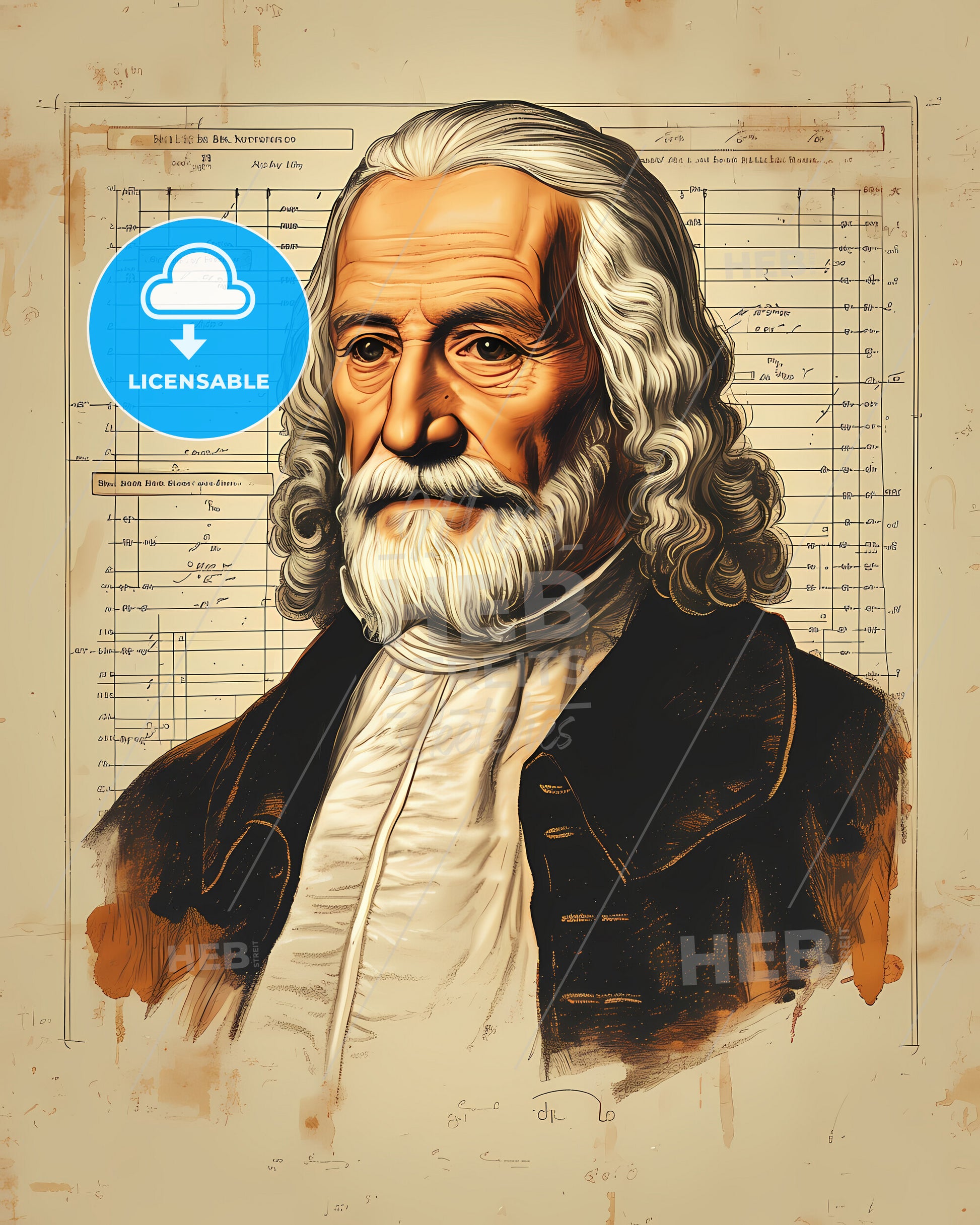 Portrait of Richard Baxter, 1615 - 1691, Puritan Divine and Writer, English Puritan theologian, known for his pastoral work and devotional writings. - smiling. Vintage art illustration on bright beige paper background, sweeping overdrawn lines, subtile colored artwork, that captures the playful spirit and vivid imagination of modern art.