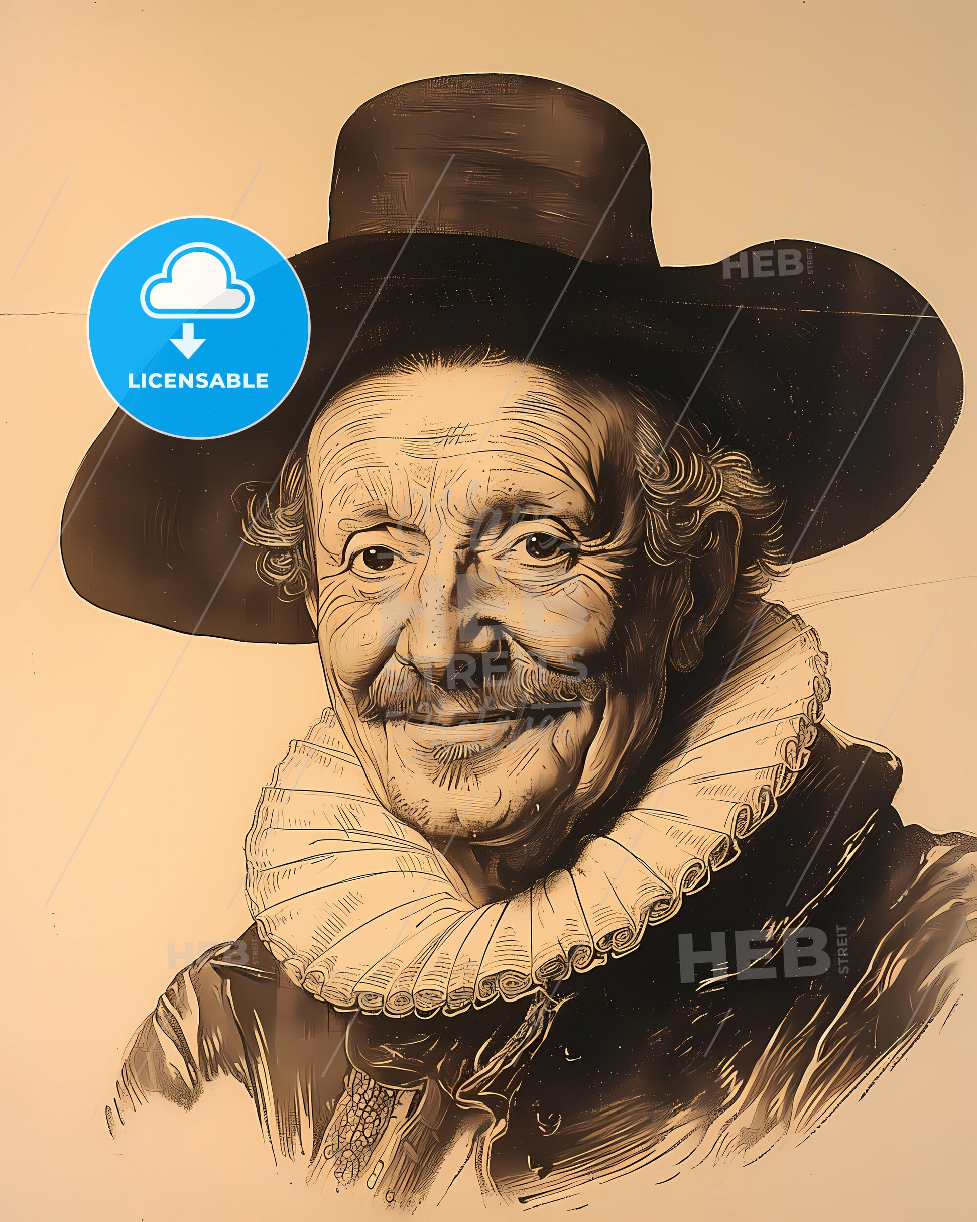 Portrait of Richard Hakluyt, 1553 - 1616, Geographer - smiling. Vintage art illustration on bright beige paper background, sweeping overdrawn lines, subtile colored artwork, that captures the playful spirit and vivid imagination of modern art.