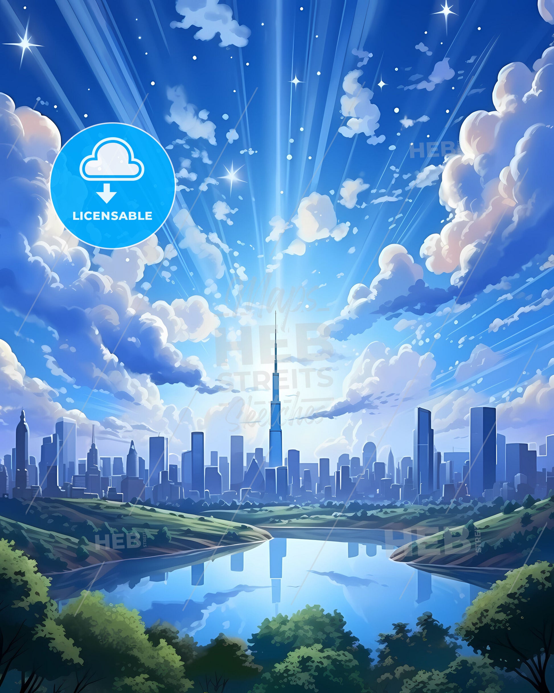 Vibrant Cityscape Painting: Artistic Rio Branco Brazil Skyline with Serene River and Clouds
