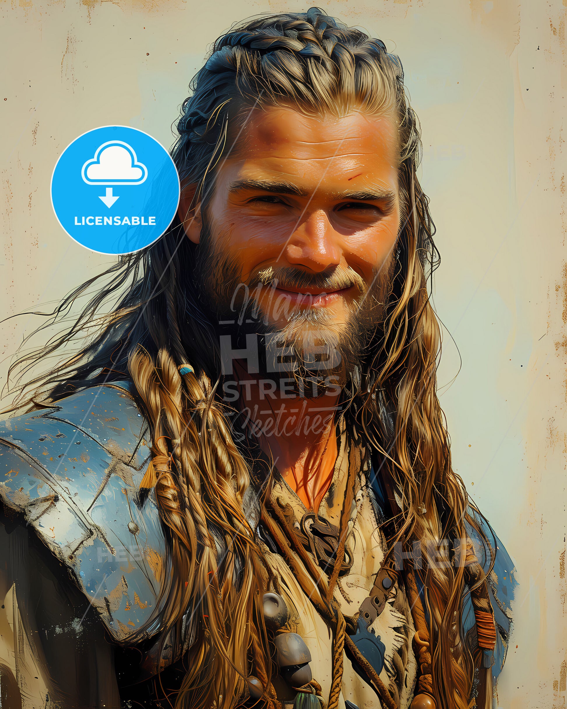 Portrait of Rollo, c. 860 - c. 930, Founder of Normandy, Viking chieftain who became the first ruler of the Viking principality of Normandy. smiling. Vintage art illustration on bright beige paper background - historic art style, sweeping overdrawn lines, subtile colored artwork, that captures the playful spirit and vivid imagination of modern art.