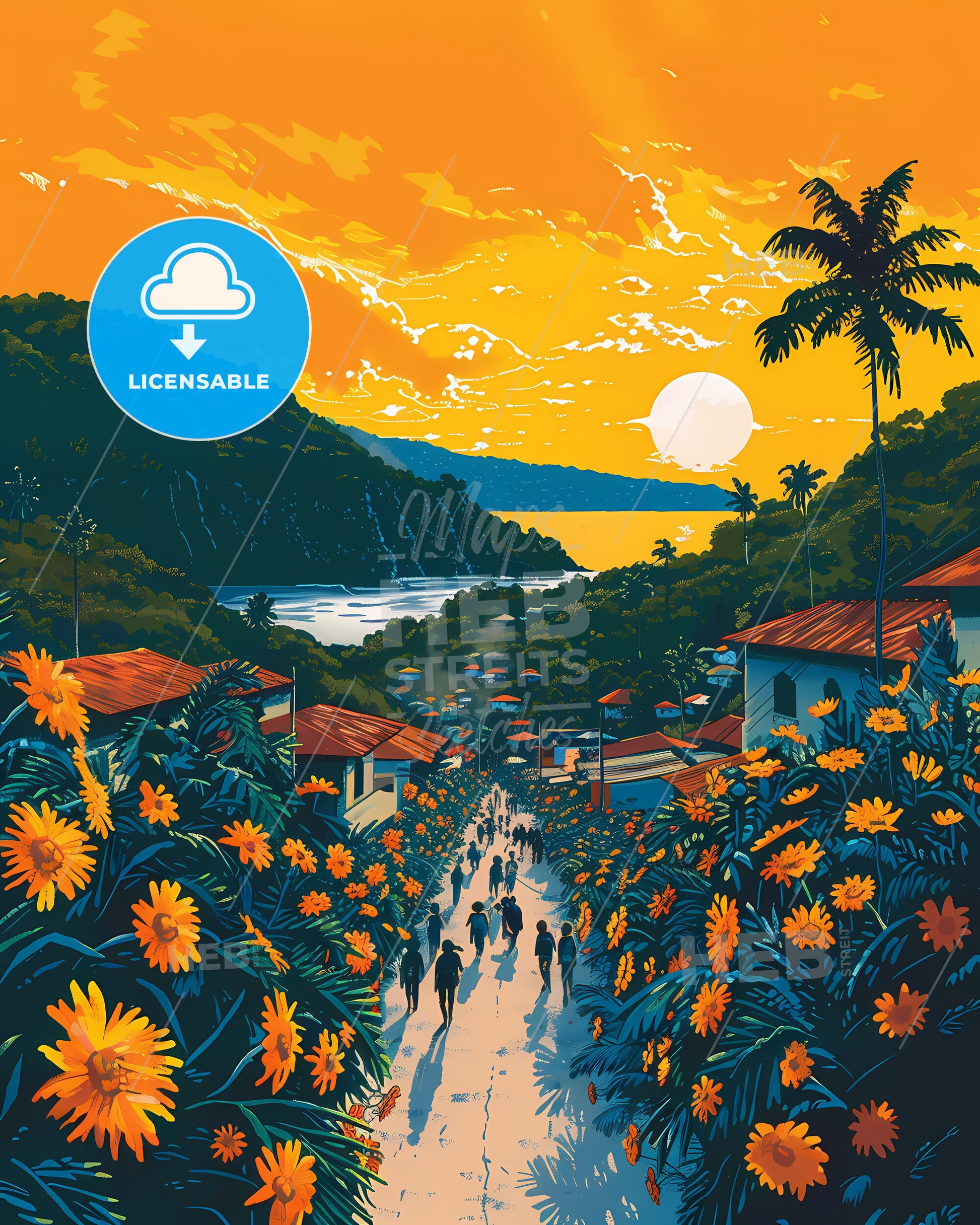 African Street Scene Painting: Vibrant Rwanda Cityscape with Flowers and Trees
