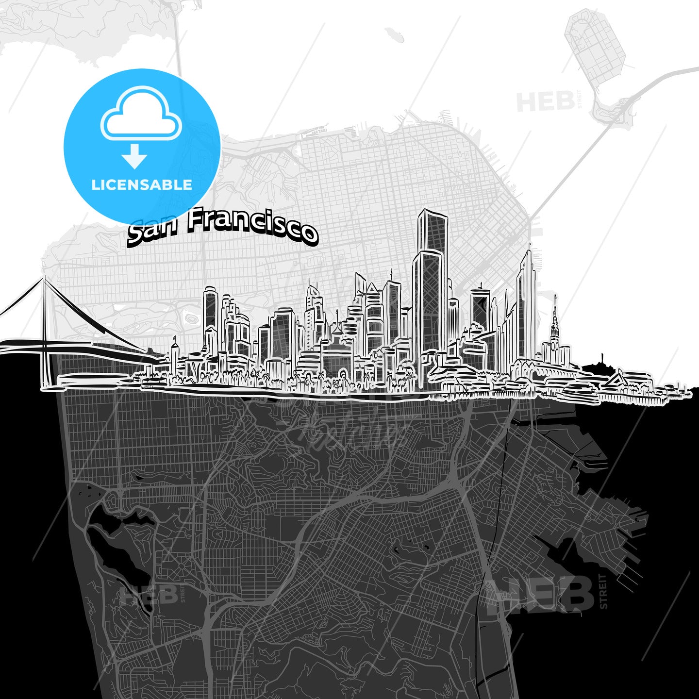 Vector drawing of San Francisco skyline with map. USA travel landmark. Black and white cover and background concept.