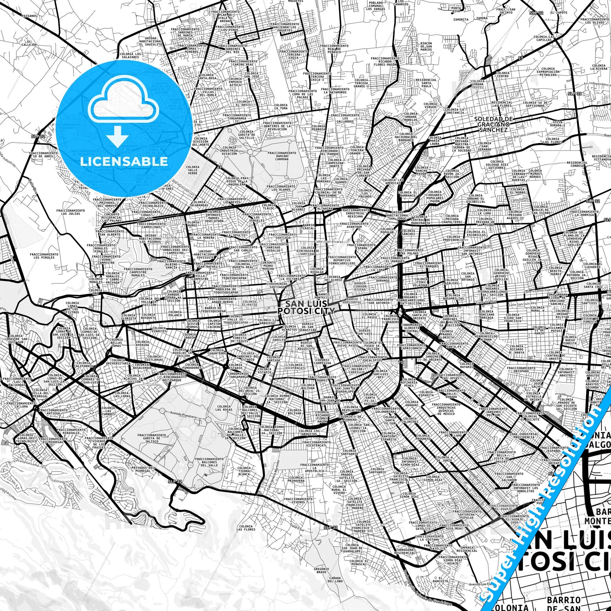 San Luis Potosí, San Luis Potosí, Mexico in high-resolution, minimalist map designed for printed use. This detailed black and white map accurately highlights the street network and urban layout, making it an ideal ready-to-use map for your business.
