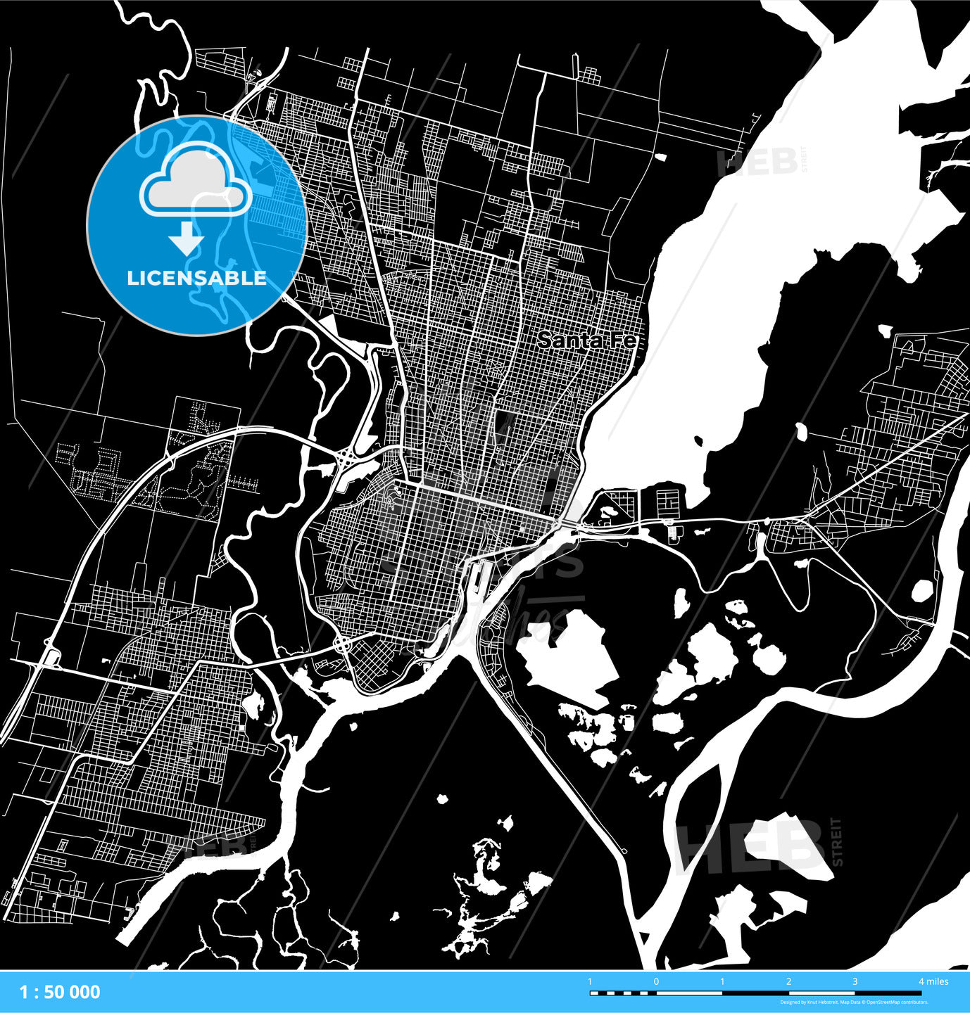 Santa Fe, Argentina Download Map. White streets and water on black. This map will show only basic shapes for landmarks and traffic. No information about naming, borders, symbols or buildings. Useable for backgrounds in any digital or printed medium. Vector version is scalable for any size.