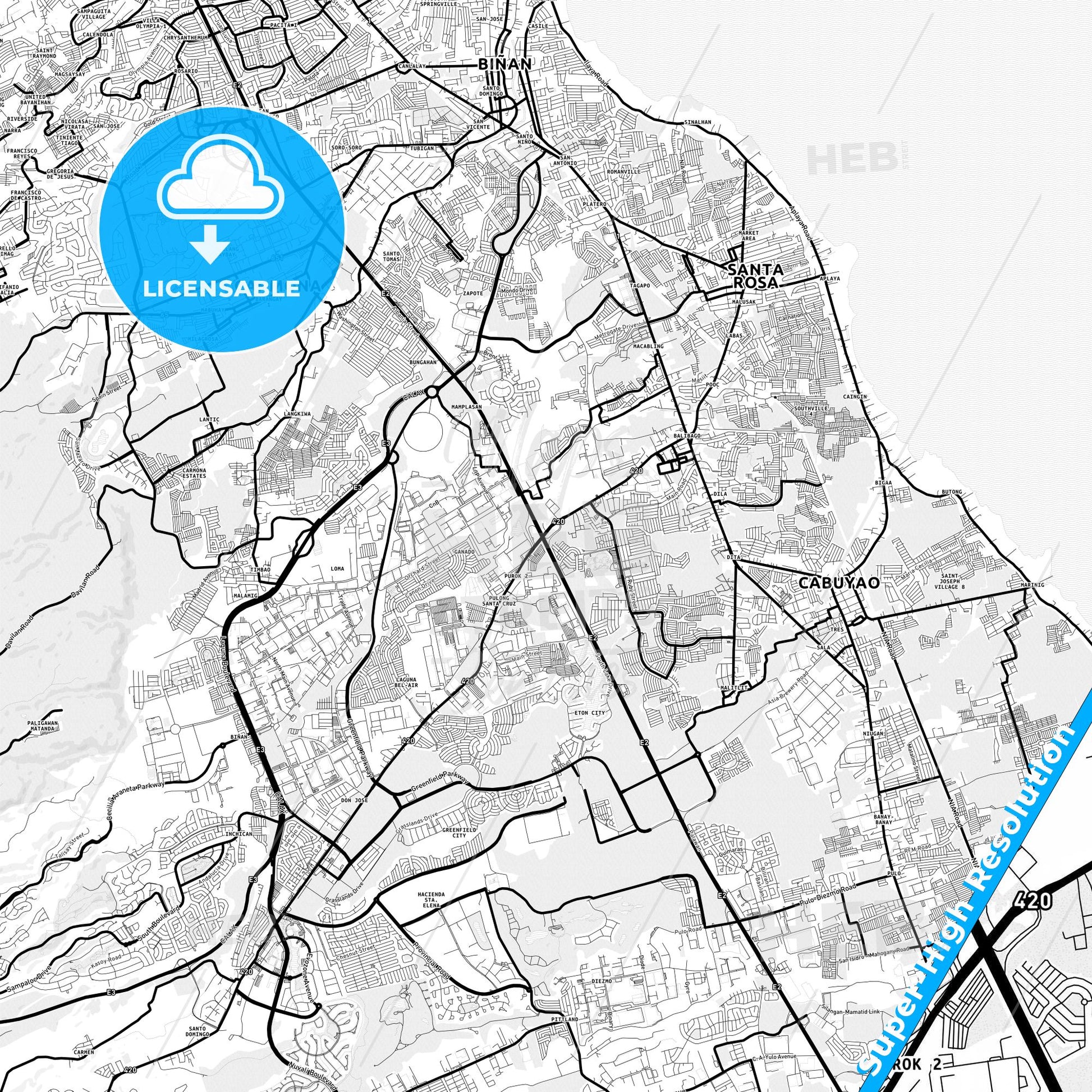 Santa Rosa, Laguna, Philippines in high-resolution, minimalist map designed for printed use. This detailed black and white map accurately highlights the street network and urban layout, making it an ideal ready-to-use map for your business.