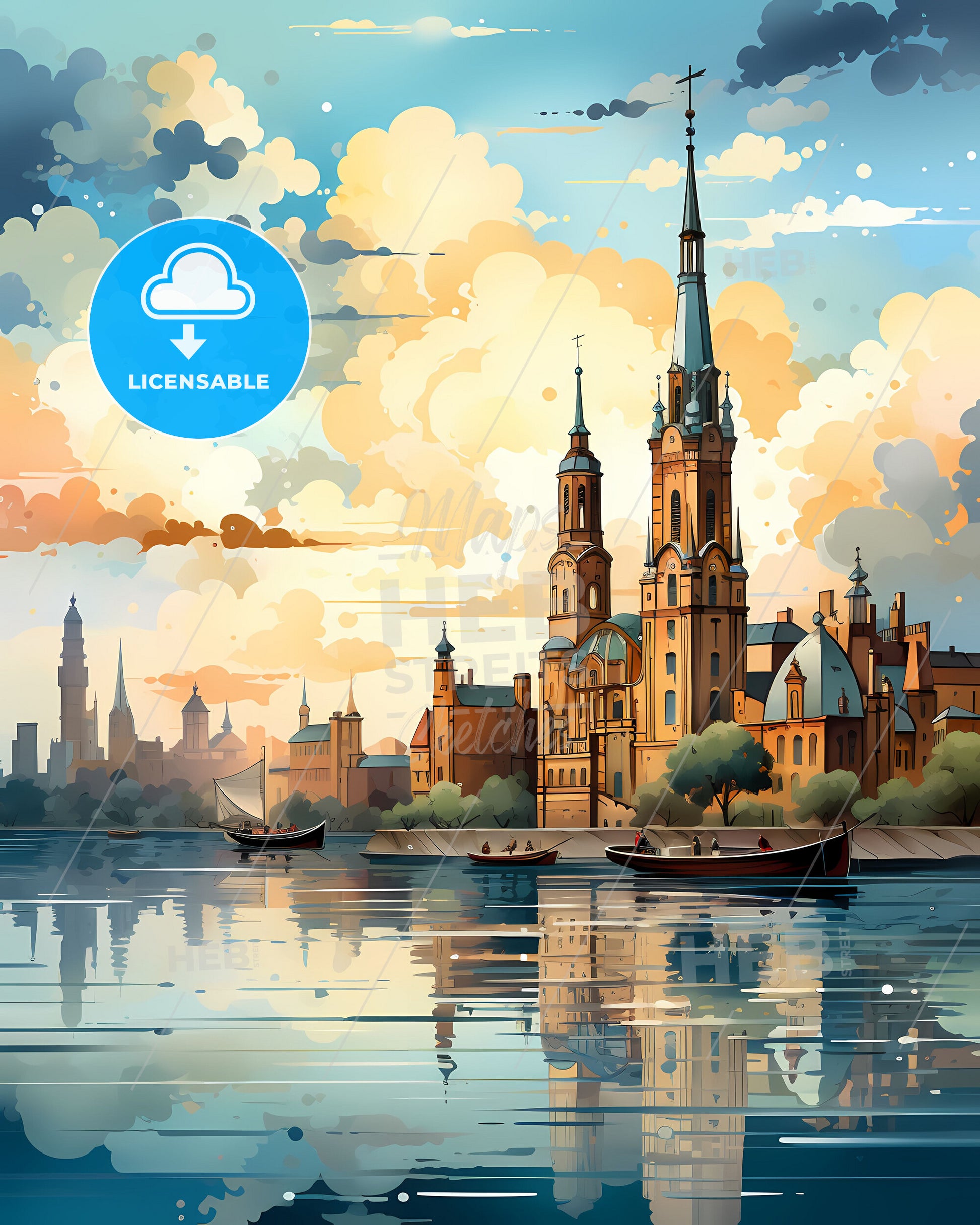 Santiago del Estero Argentina Skyline. art painting with blue sky some bright clouds in spring. in style of classic advertising illustration with nice gradients. Nice strokes and outlines. Large area of copy space on top. litte bright sparkles
