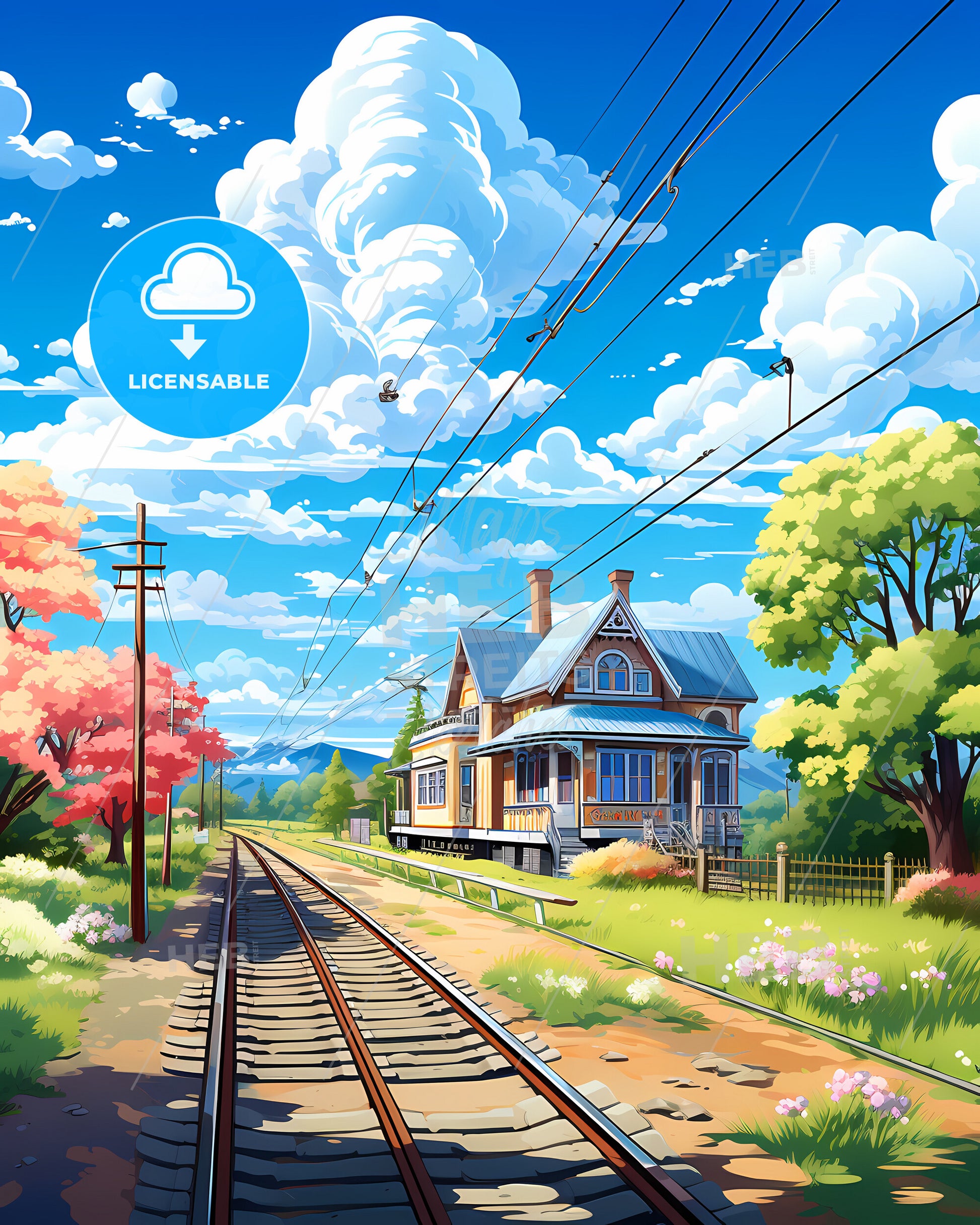 Sarpsborg, Oestfold, Norway, Skyline. art painting with blue sky some bright clouds in spring. in style of classic advertising illustration with nice gradients. Nice strokes and outlines that captures the playful spirit and vivid imagination of modern art.