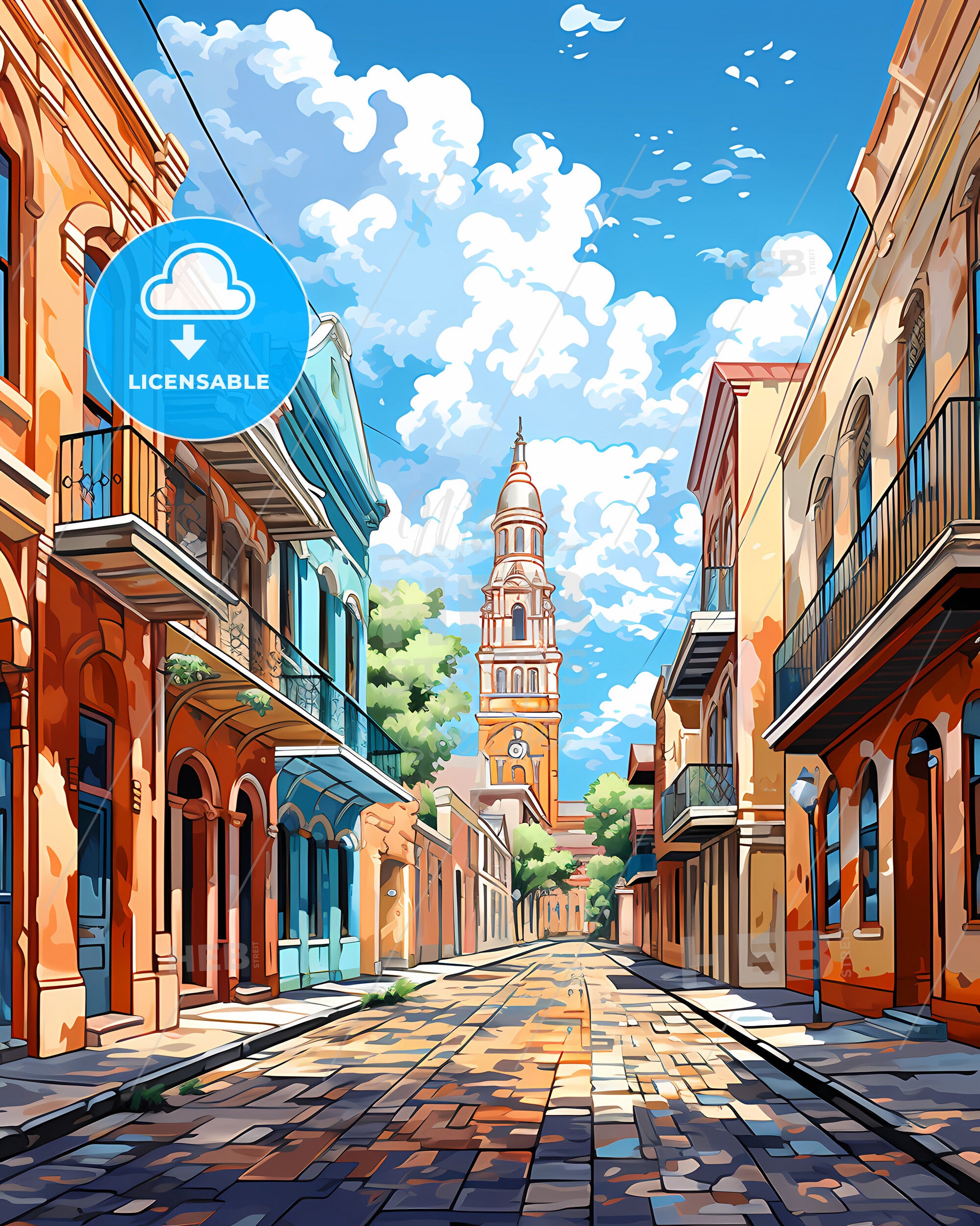 Schagen, North Holland, Netherlands, Skyline. art painting with blue sky some bright clouds in spring. in style of classic advertising illustration with nice gradients. Nice strokes and outlines that captures the playful spirit and vivid imagination of modern art.