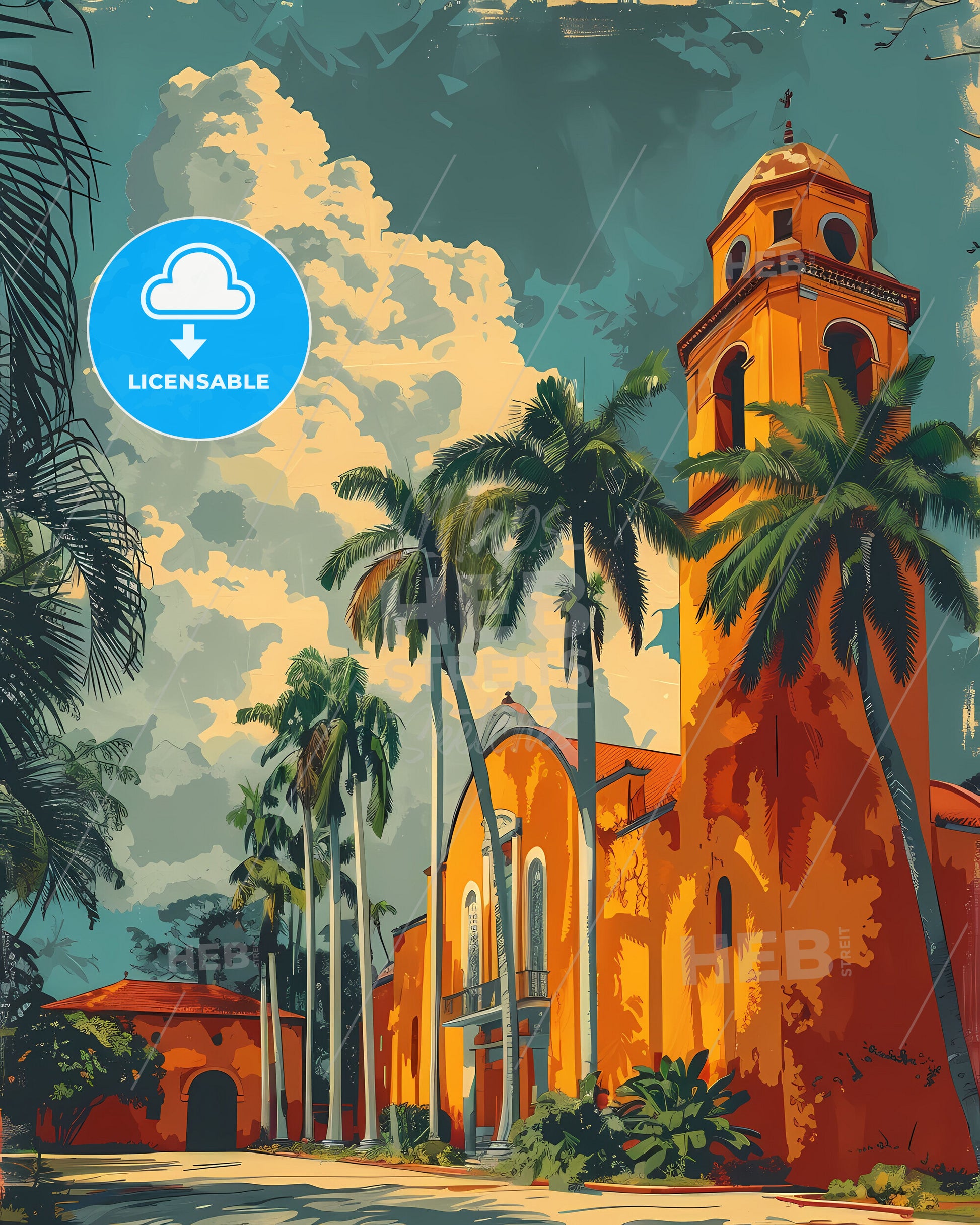 Senegal, Africa - Colorful & Vibrant Painting of a Building with Palm Trees