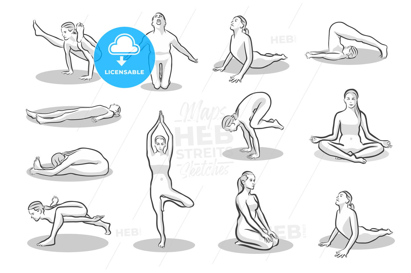 Set of twelve yoga poses. hand-drawn vector sketches separated on white.