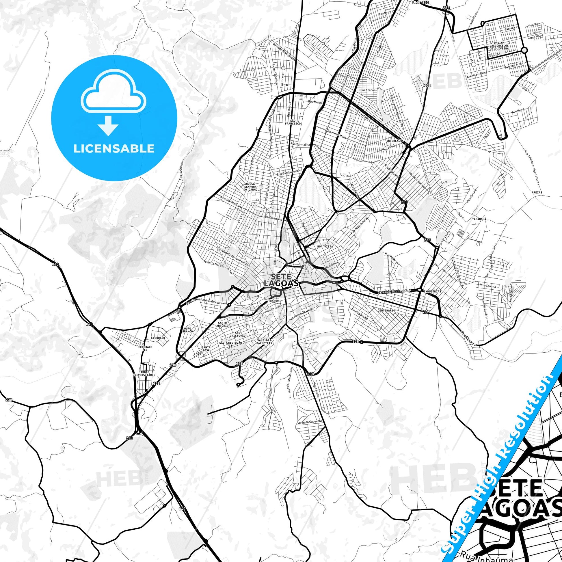 Sete Lagoas, Brazil in high-resolution, minimalist map designed for printed use. This detailed black and white map accurately highlights the street network and urban layout, making it an ideal ready-to-use map for your business.