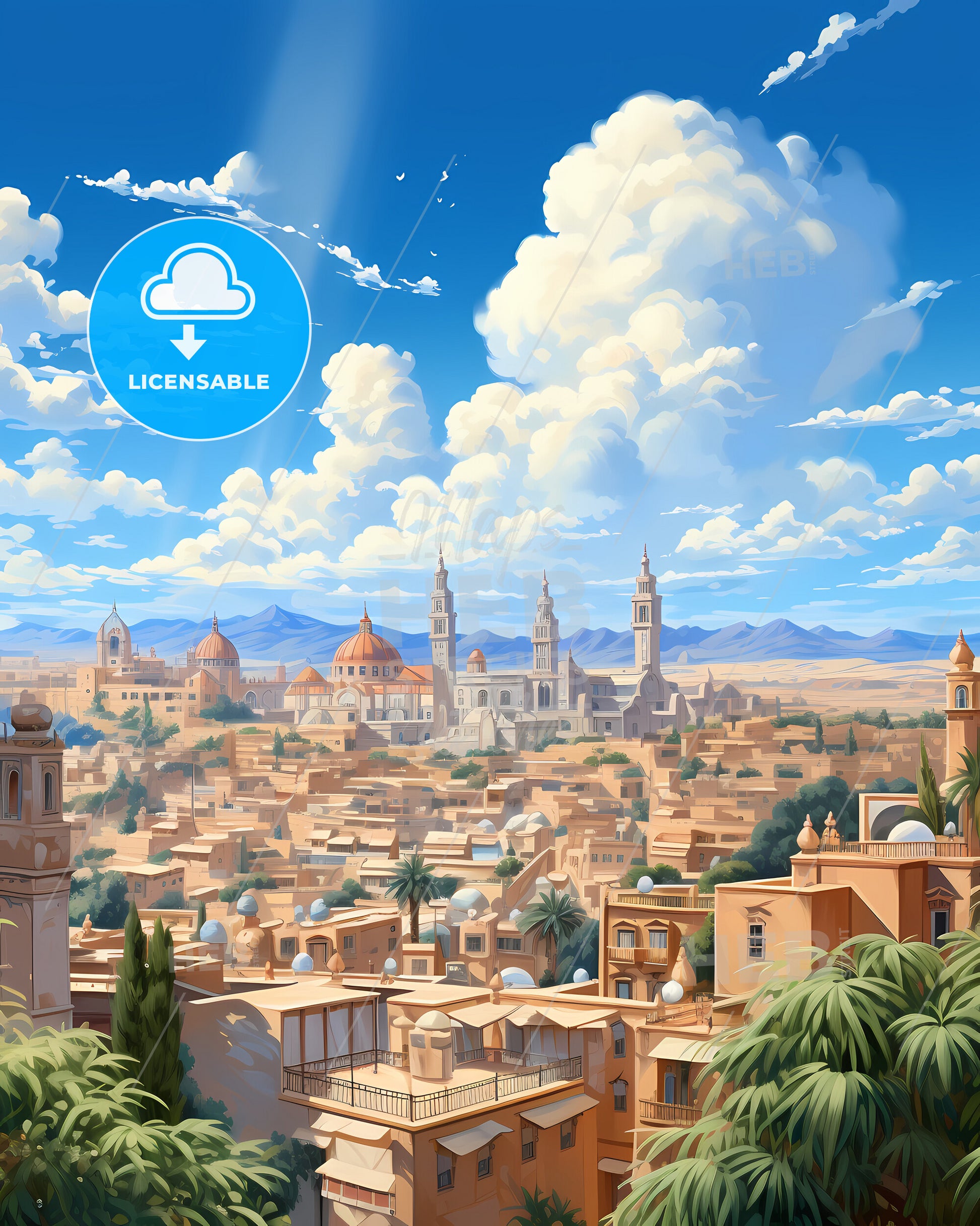 Sevilla, Spain, Skyline. art painting with blue sky some bright clouds in spring. in style of classic advertising illustration with nice gradients. Nice strokes and outlines that captures the playful spirit and vivid imagination of modern art.