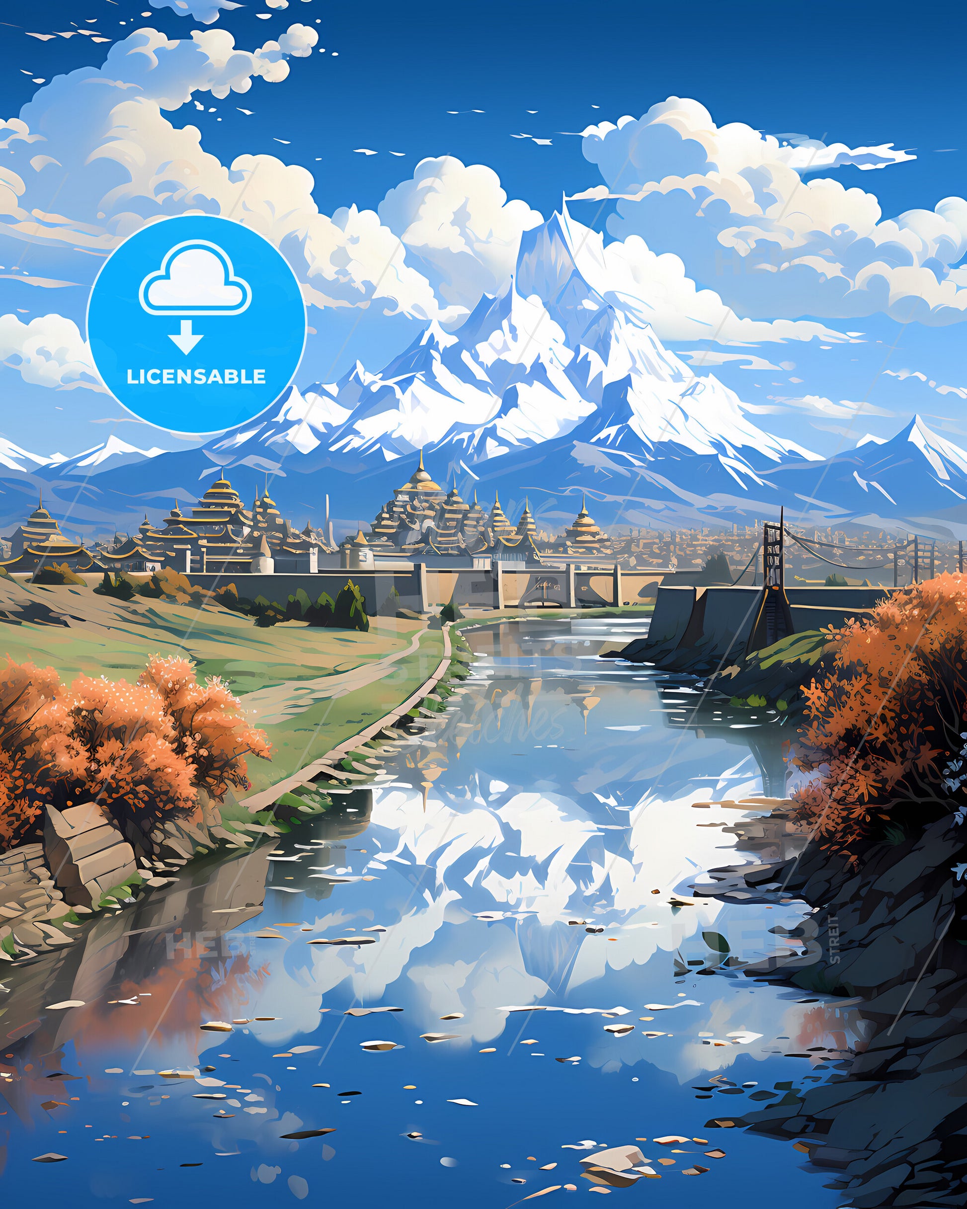 Shymkent, South Kazakhstan Region, Kazakhstan, Skyline. art painting with blue sky some bright clouds in spring. in style of classic advertising illustration with nice gradients. Nice strokes and outlines that captures the playful spirit and vivid imagination of modern art.