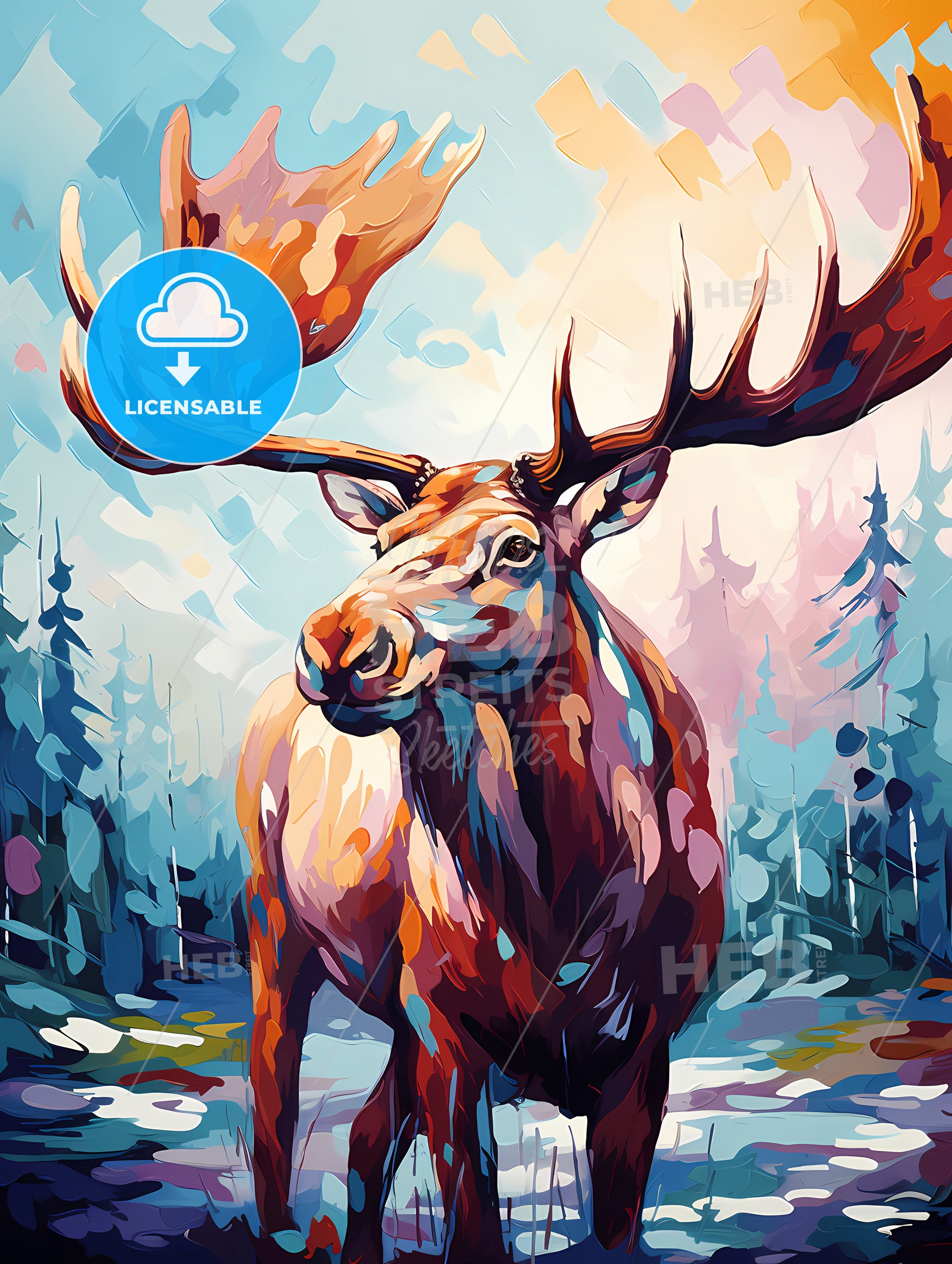 Silhouette Moose On White Background - a moose with large antlers in a snowy forest