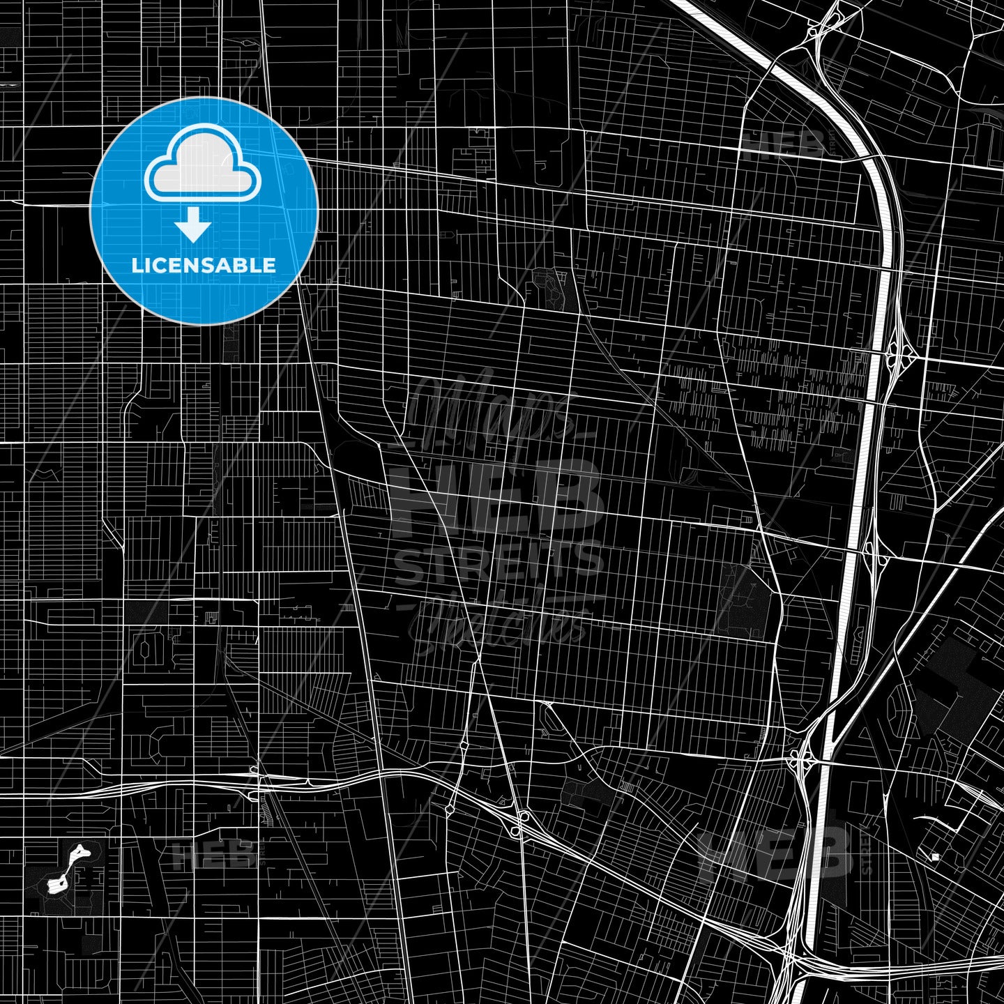 Black and white vector map of South Gate, California, United States with fine structures and patterns for download. This printable map of South Gate with major and minor roads has been carefully designed for all personal and professional needs. The pure PDF vector version of this map is fully scalable. Depending on our license, you can use this map for websites, marketing background and wall art.
