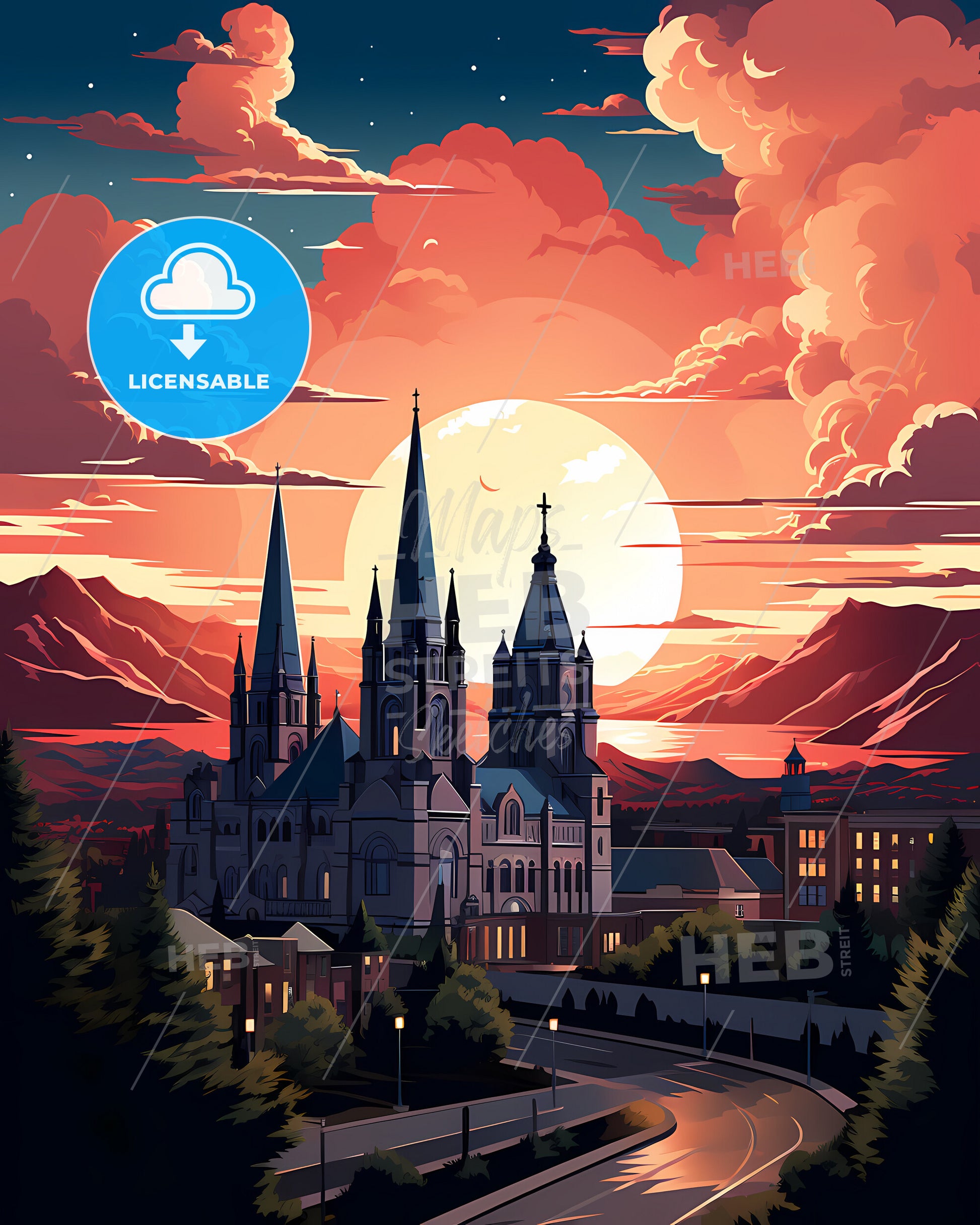 South Jordan, Utah, Skyline. art painting with blue sky some bright clouds in spring. in style of classic advertising illustration with nice gradients. Nice strokes and outlines that captures the playful spirit and vivid imagination of modern art.