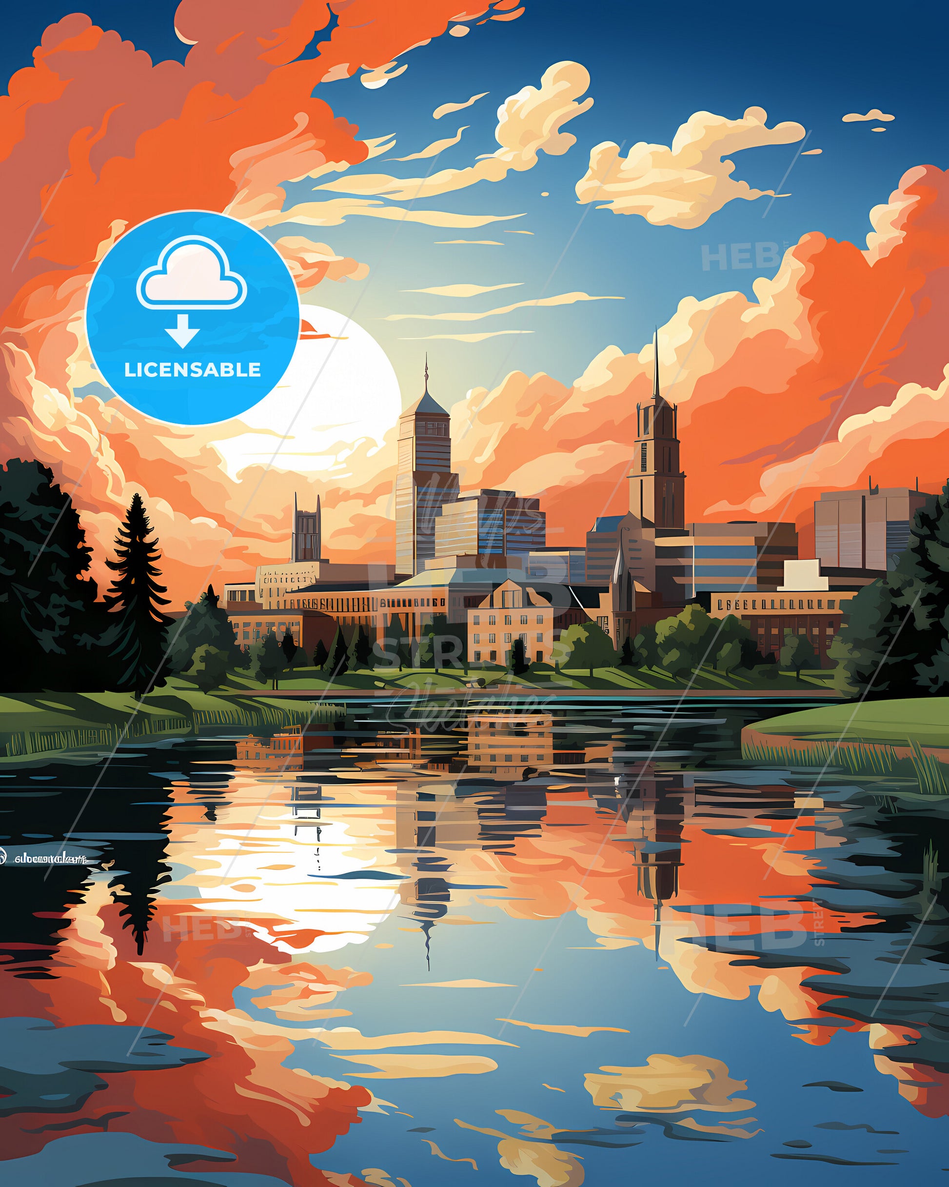 Spokane, Washington, Skyline. art painting with blue sky some bright clouds in spring. in style of classic advertising illustration with nice gradients. Nice strokes and outlines that captures the playful spirit and vivid imagination of modern art.