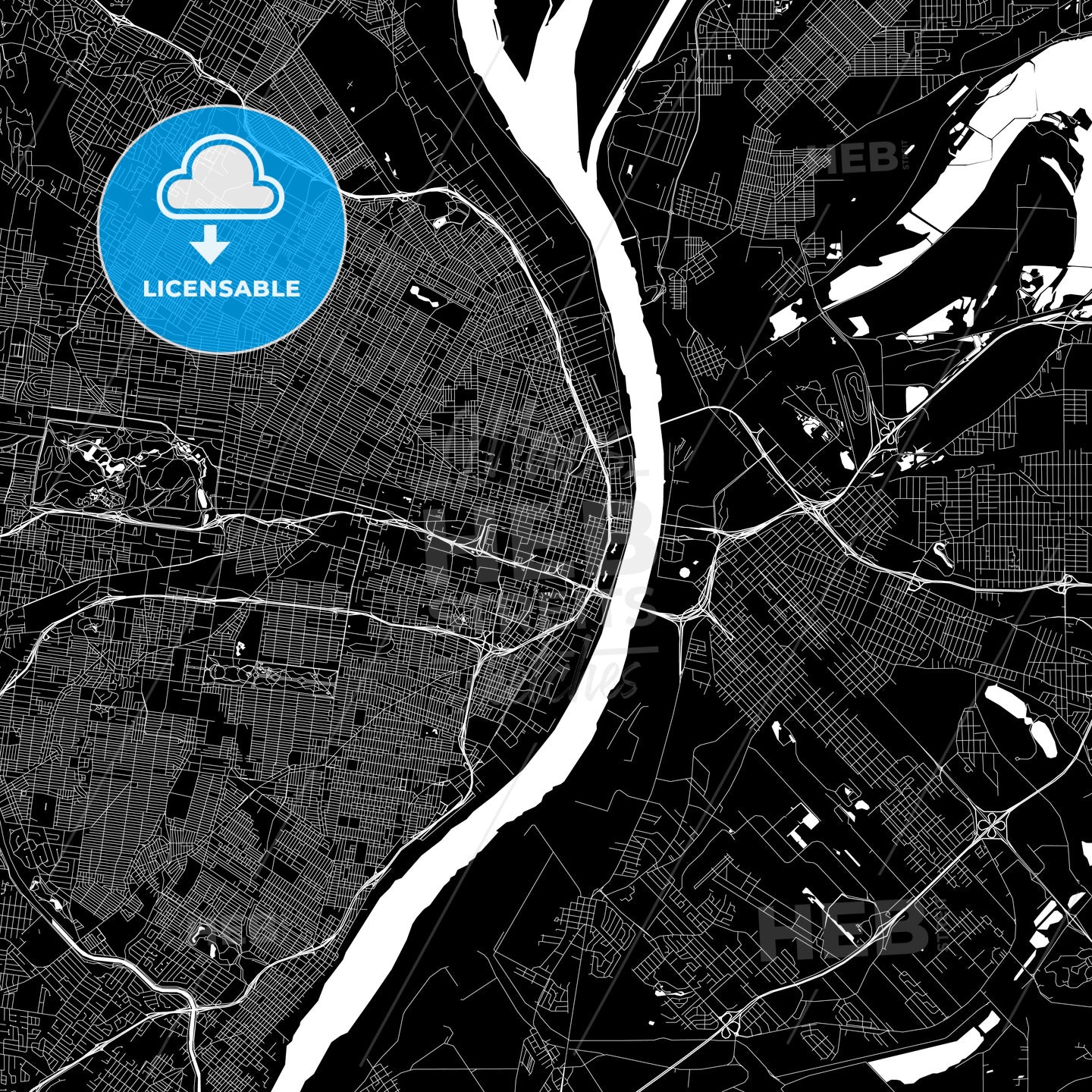 St Louis USA Download PDF Map. Highly detailed art map for infographic background. White highways, streets and water on black. Bigger bridges with outlines. This map will show only basic shapes for landmarks and traffic. No information about naming, borders, symbols or buildings. Useable for backgrounds in any digital or printed medium. PDF (1.4) version is scalable for any size.