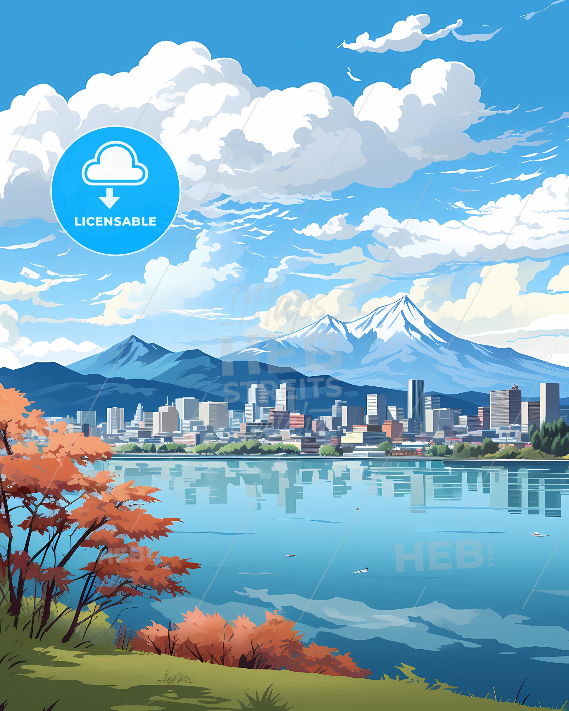 Stavanger, Rogaland, Norway, Skyline. art painting with blue sky some bright clouds in spring. in style of classic advertising illustration with nice gradients. Nice strokes and outlines that captures the playful spirit and vivid imagination of modern art.